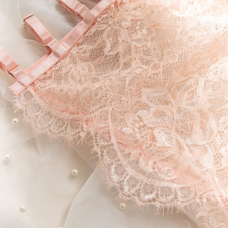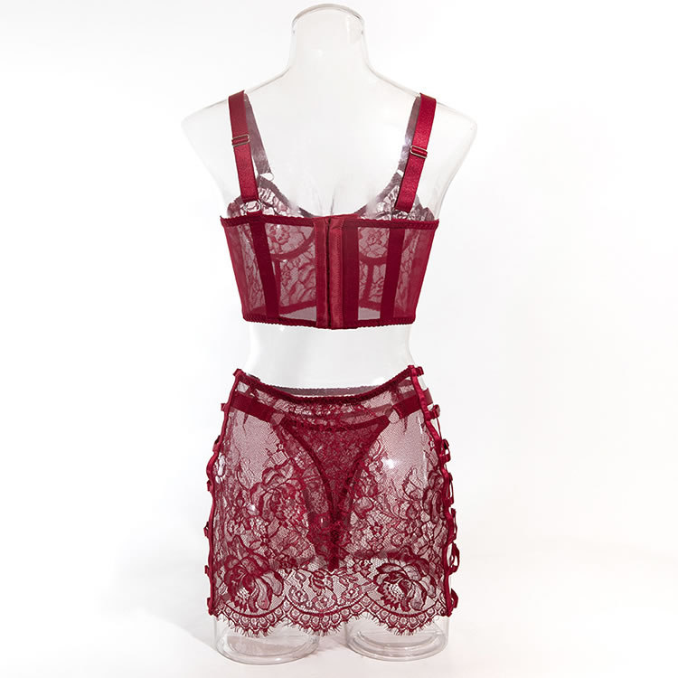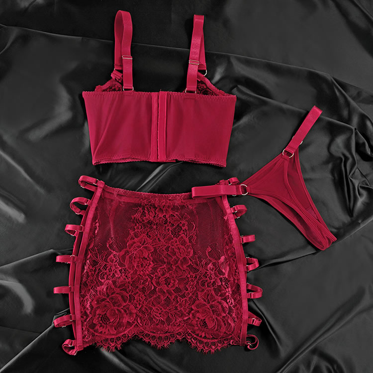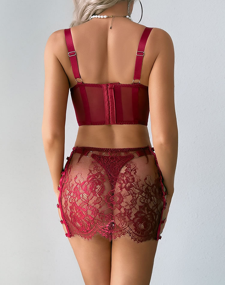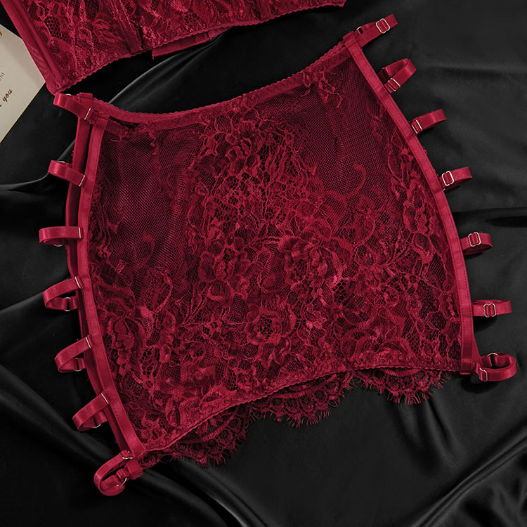 This exquisite lingerie set features a rich burgundy color with intricate lace detailing. The sweetheart neckline enhances the décolletage beautifully, while the sheer mesh fabric adds a touch of allure and romance. The fitted design accentuates the figure, creating a flattering and elegant silhouette. The adjustable straps ensure a comfortable and customizable fit, making it perfect for both intimate moments and stylish boudoir photoshoots.