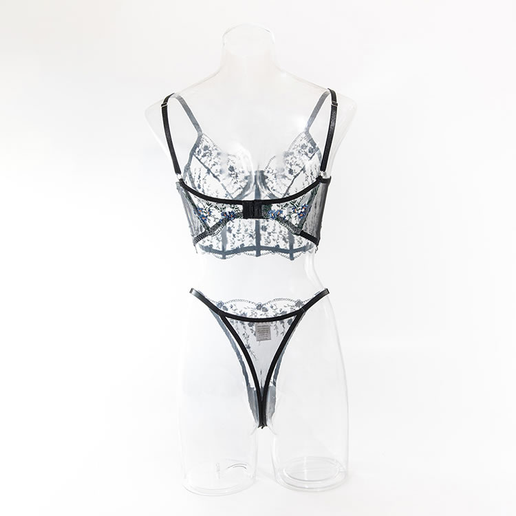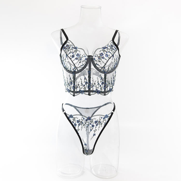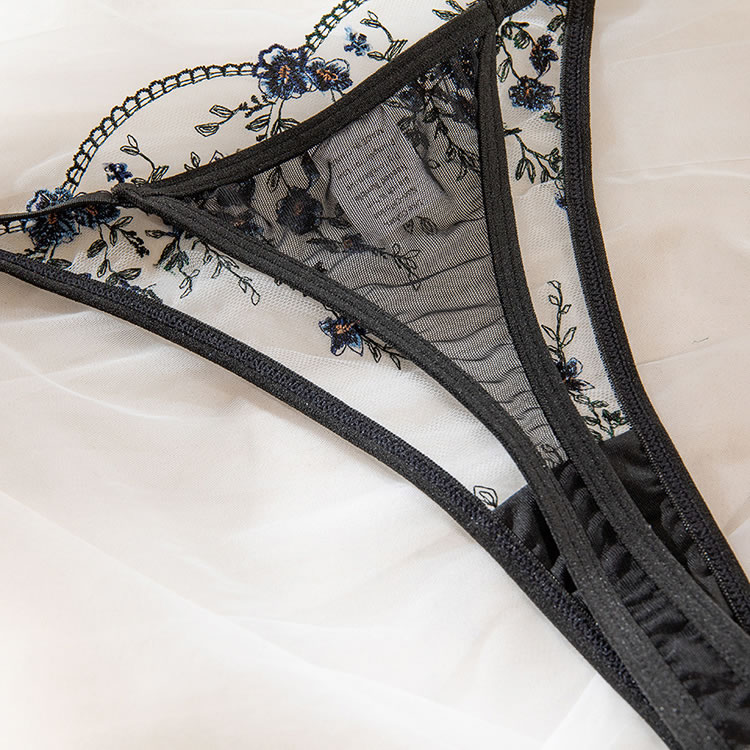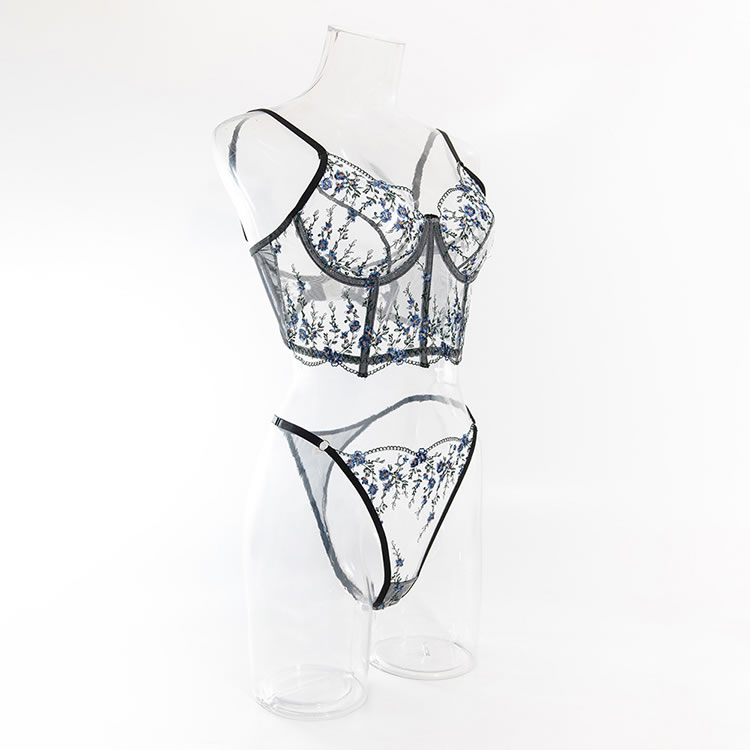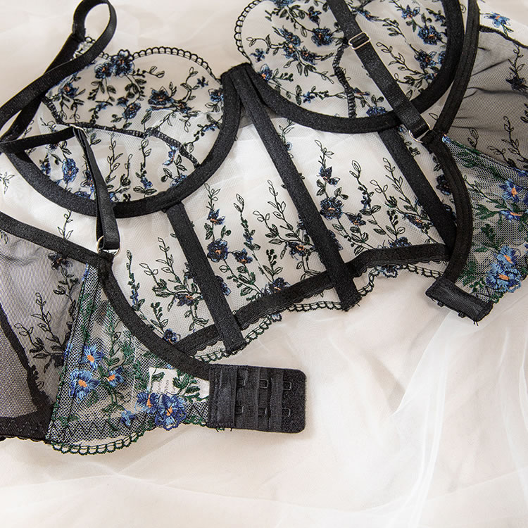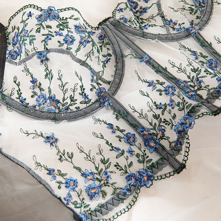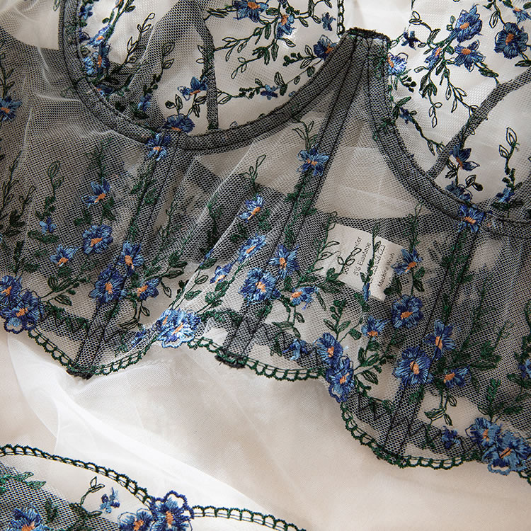 This elegant floral embroidered lingerie set is perfect for those who appreciate a touch of romance in their intimates. The bra features intricate blue floral embroidery that adds a playful and charming vibe, while the sheer fabric ensures both style and comfort. The matching panties offer a flirty and captivating look, making it an ideal choice for anyone seeking a blend of confidence and allure.