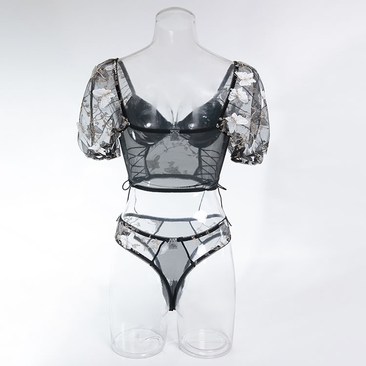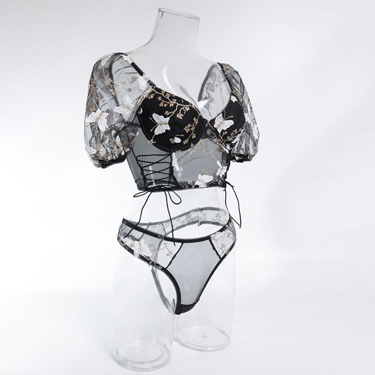 This exquisite lingerie set features a captivating blend of sheer mesh and intricate floral embroidery. The bra showcases delicate butterfly and flower patterns, adding a touch of romance and femininity. The matching thong complements the ensemble with its elegant design, ensuring you feel both confident and alluring.