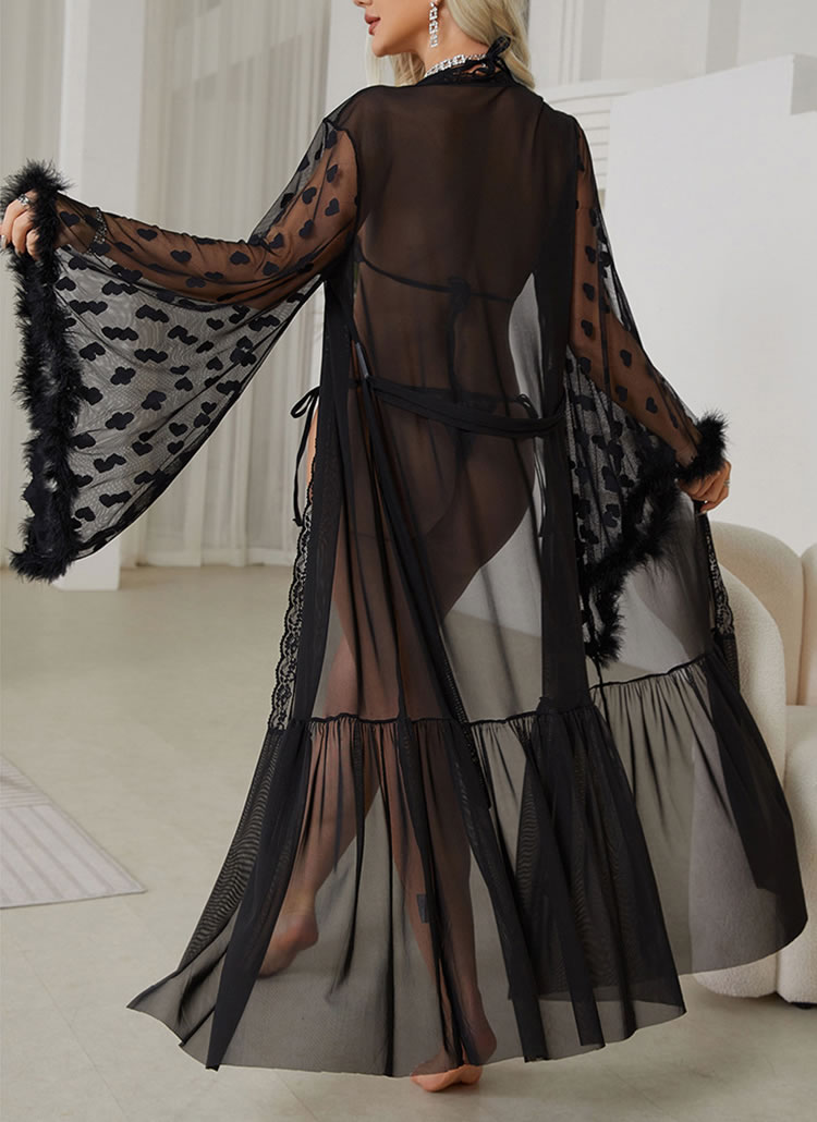 This elegant lingerie set is designed to exude elegance and allure. The deep V-neckline is adorned with intricate lace detailing, adding a touch of romance and sophistication. The sheer fabric enhances the visual appeal, creating a seductive and feminine look. While the flowing skirt provides a comfortable and graceful silhouette. The bell sleeves feature heart patterns and feather trim, adding a charming and playful detail. This set is perfect for special occasions or intimate moments.
