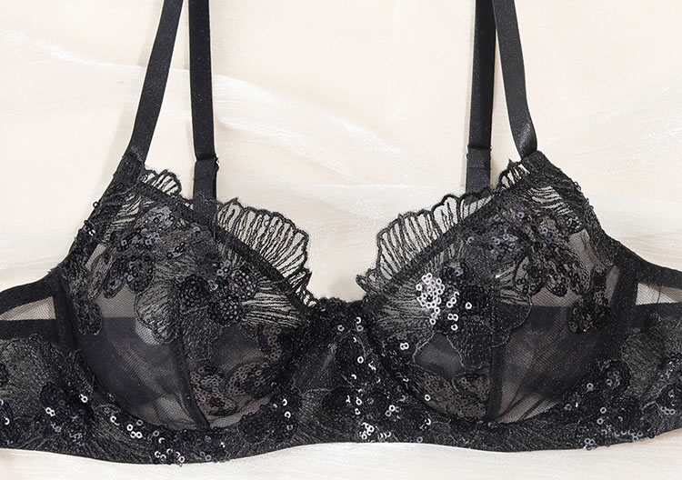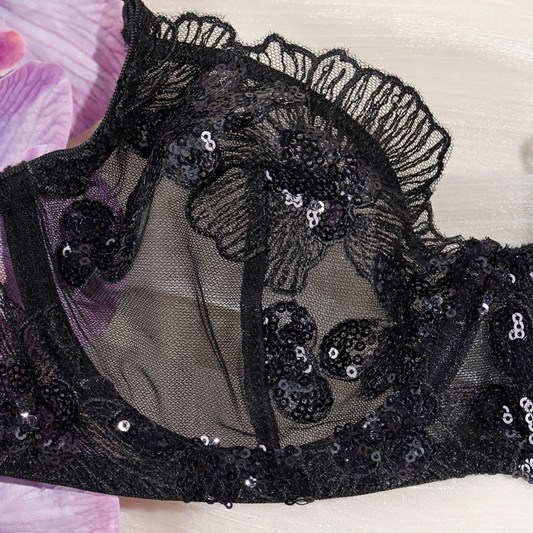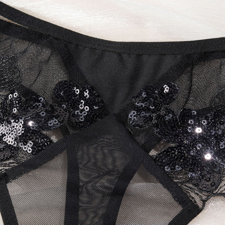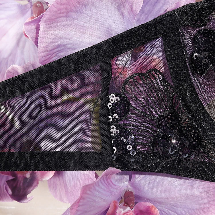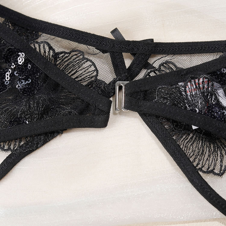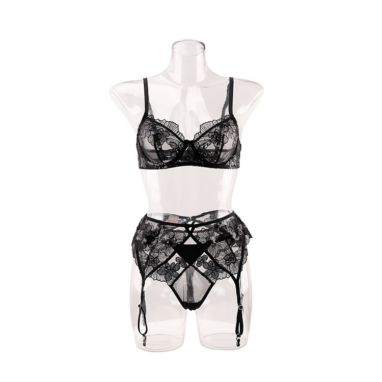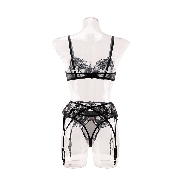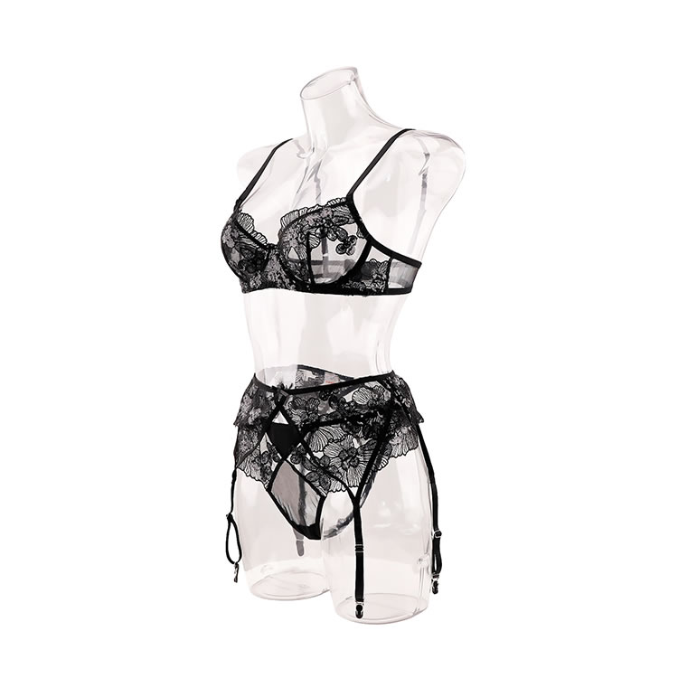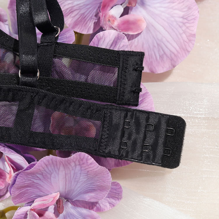This striking lingerie set features a bold design with intricate lace detailing and sheer mesh panels. The bra showcases floral embroidery that adds a touch of romance, while the matching garter belt and thong offer a seamless and flattering fit. Perfect for those who want to make a statement in their intimate wear.