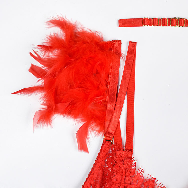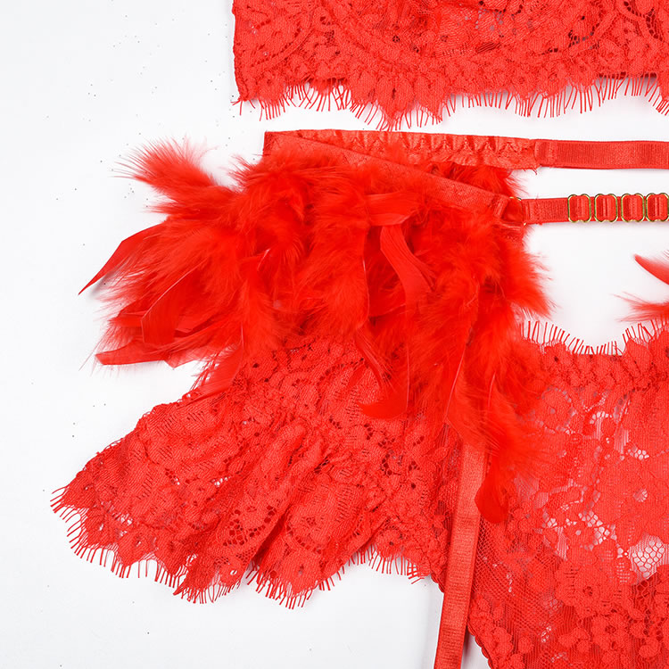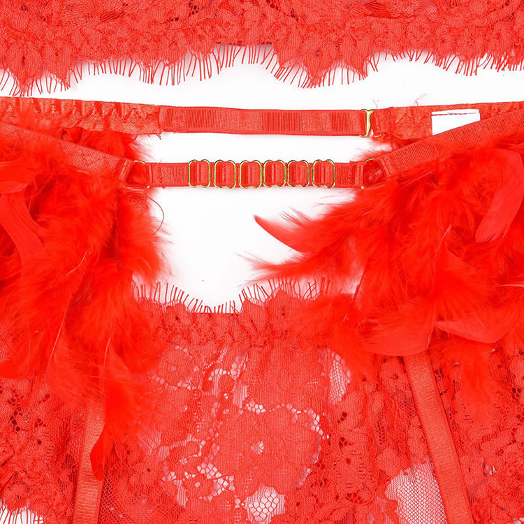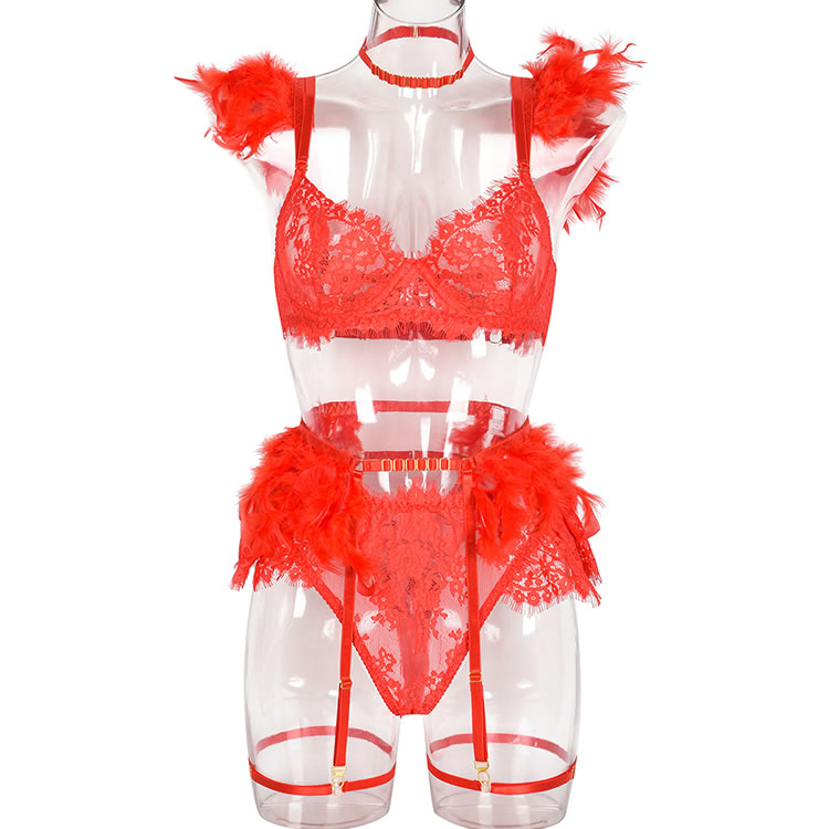 Indulge in your utmost glamour with this exquisite bra set. Enchanting with sheer lace underwire cups, the adjustable spaghetti straps showcase Tail Feather details. The allure continues with a caged back band secured by a hook and eye closure. Complete the look with a matching high-waisted garter belt featuring adjustable garter straps, wraparound leg garters, a chic Choker, and a coordinated panty. Embrace sophistication and confidence in every detail.