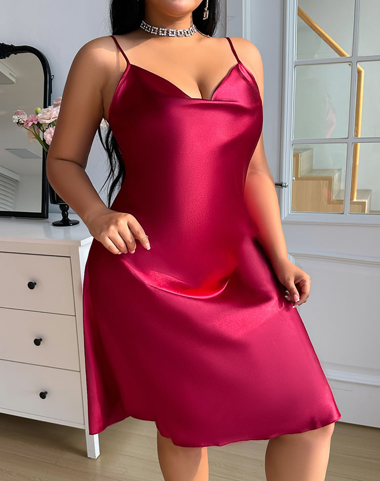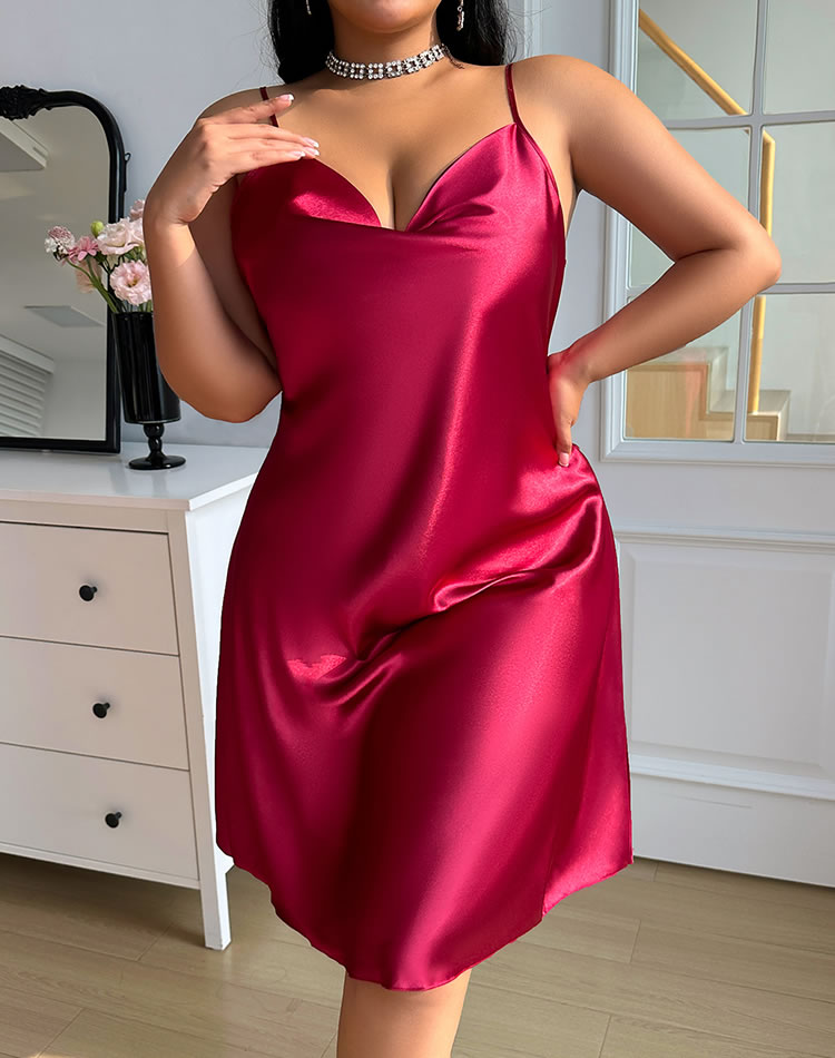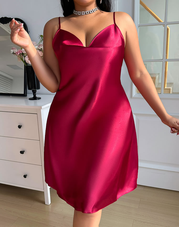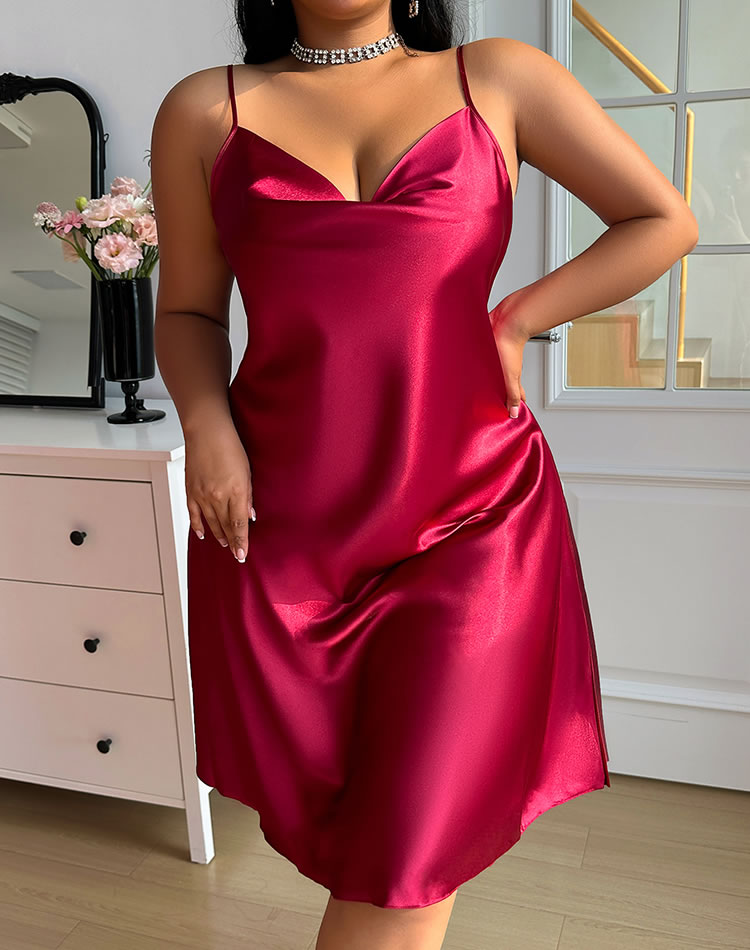 This elegant red satin slip dress is a perfect blend of comfort and style. The soft, smooth fabric feels delightful against the skin, ensuring you stay comfortable all night long. The deep V-neckline and spaghetti straps accentuate your natural curves, making it an ideal choice for both lounging at home and special evenings.