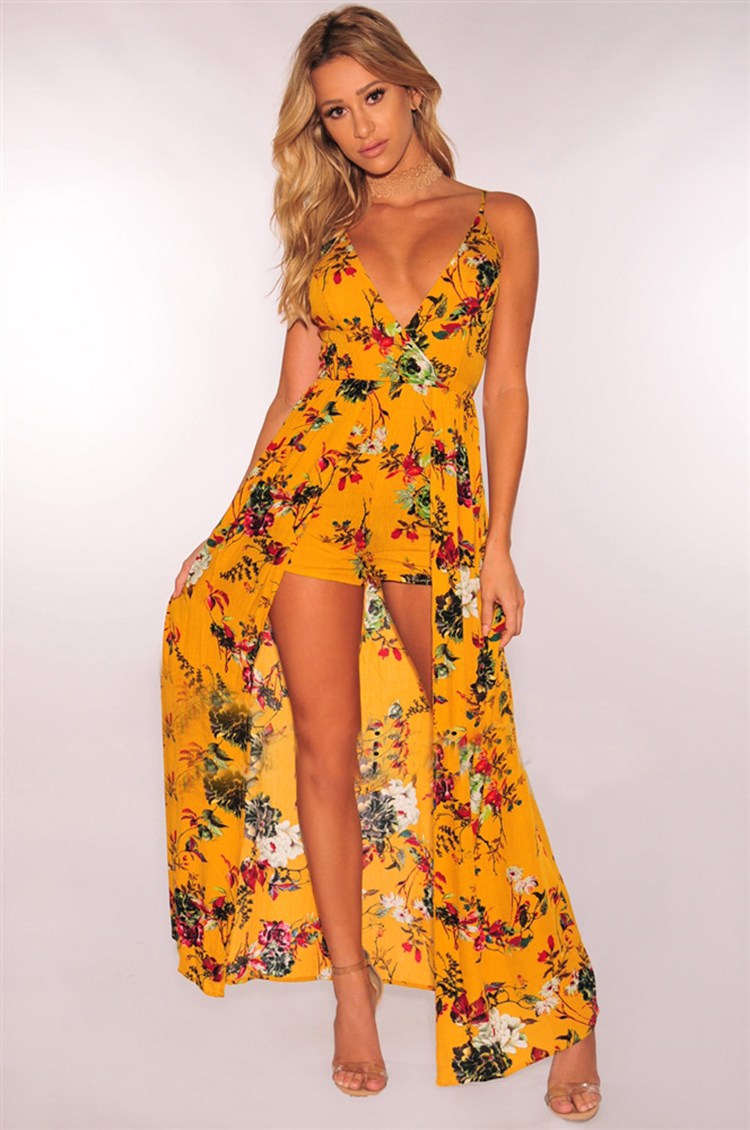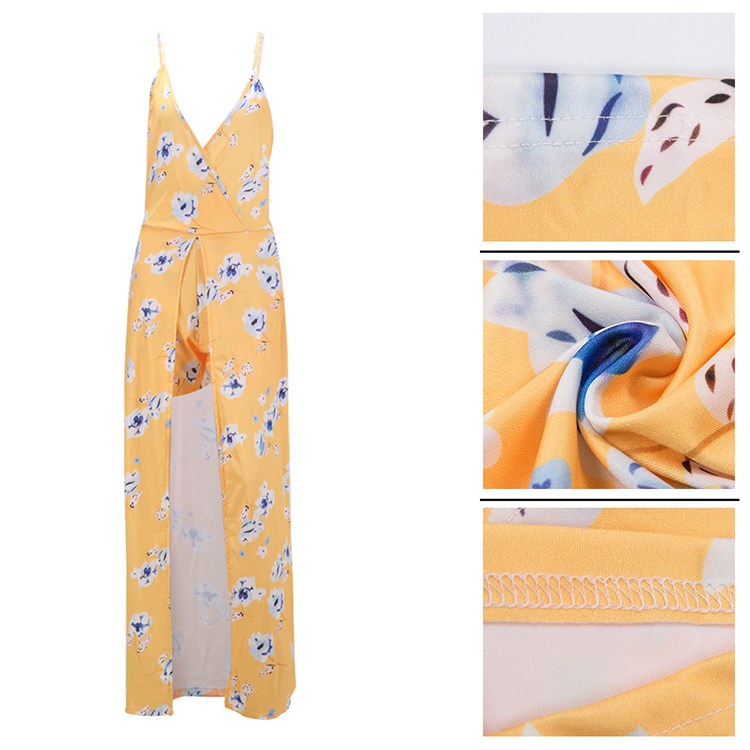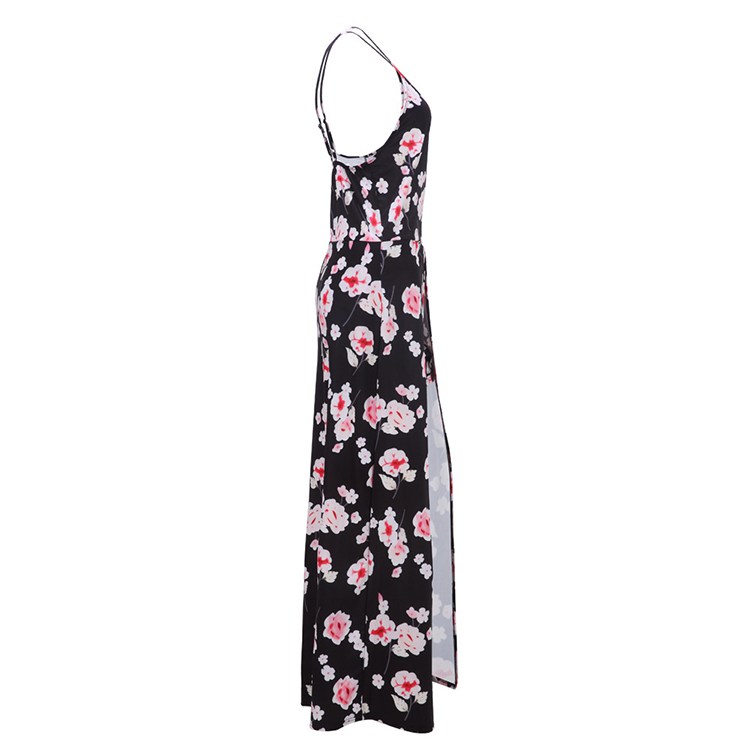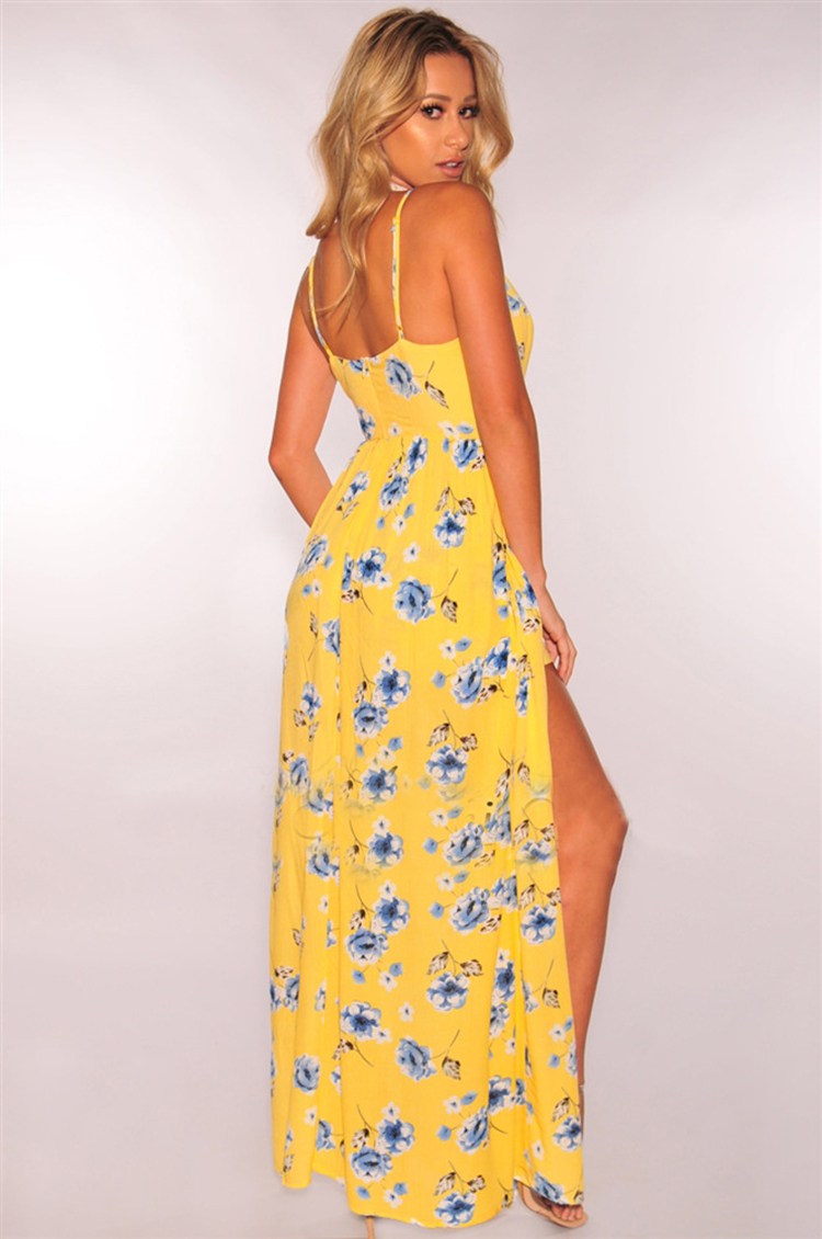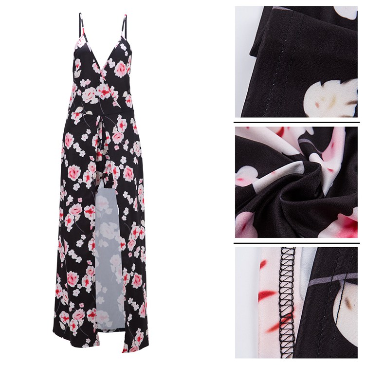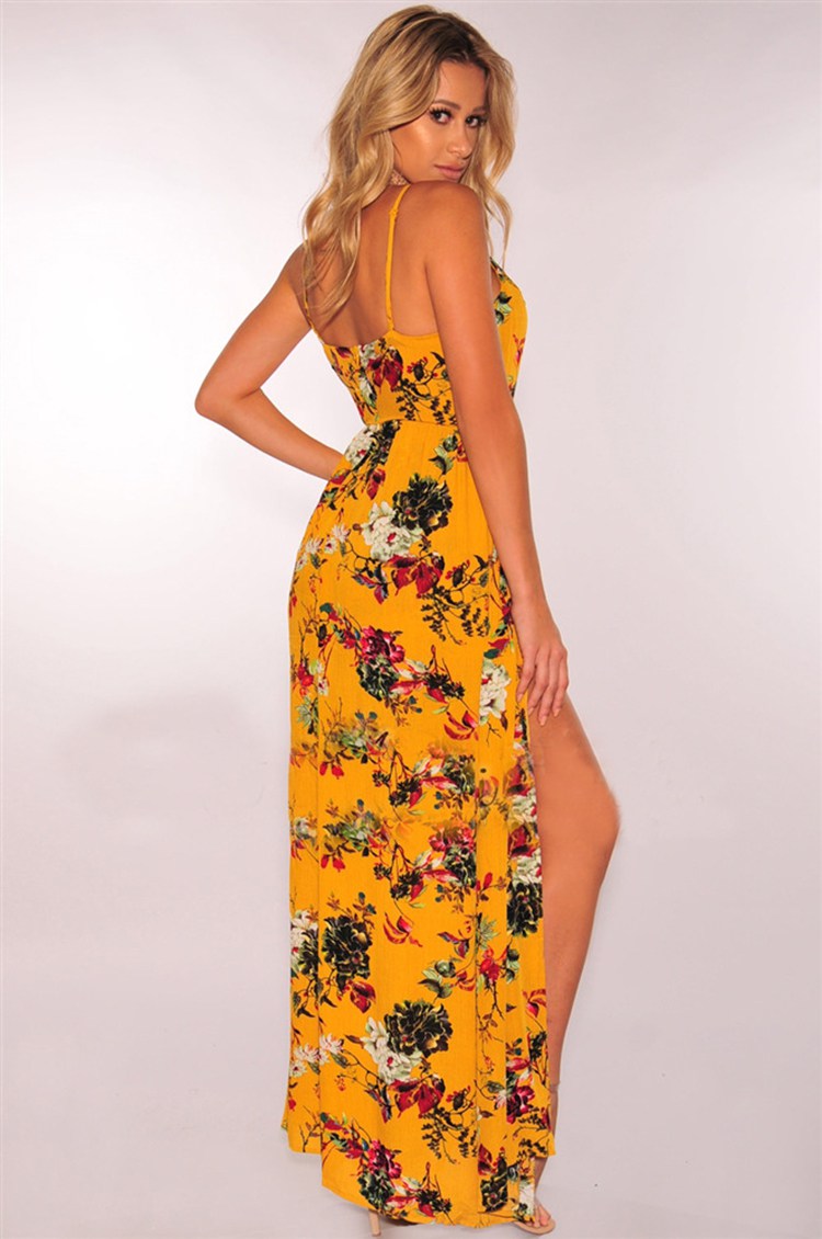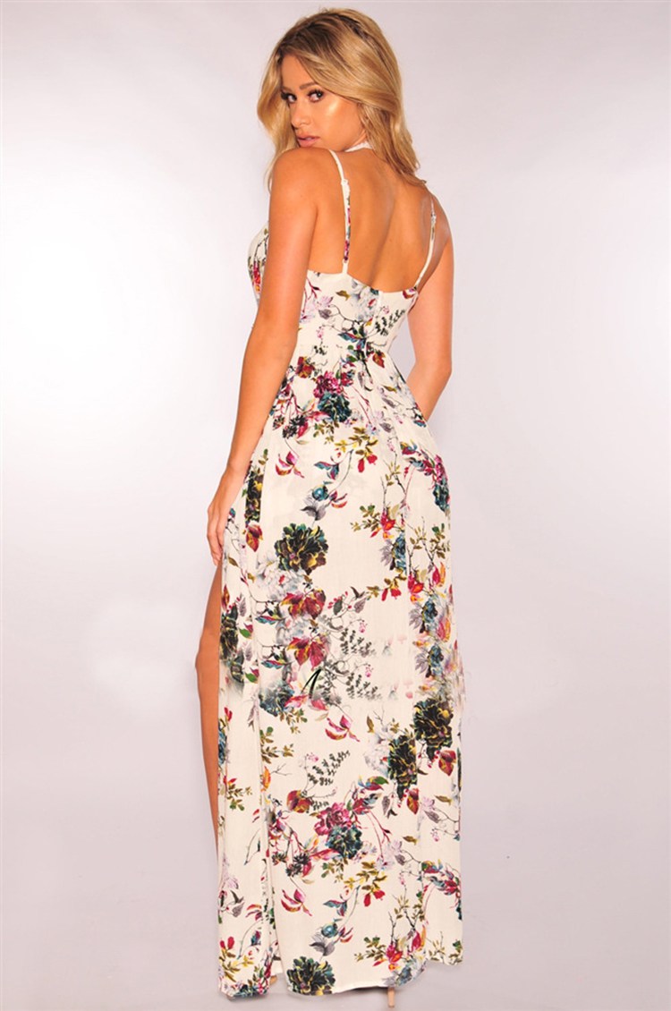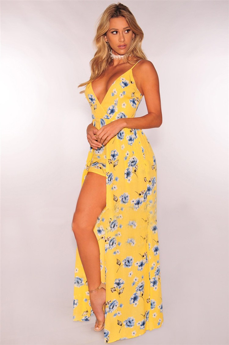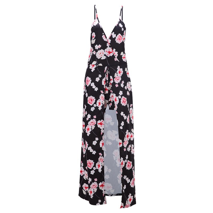 A maxi dress featuring an allover floral print, an off-center front slit, adjustable straps, and a surplice neckline.