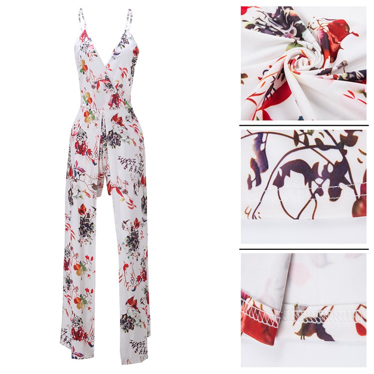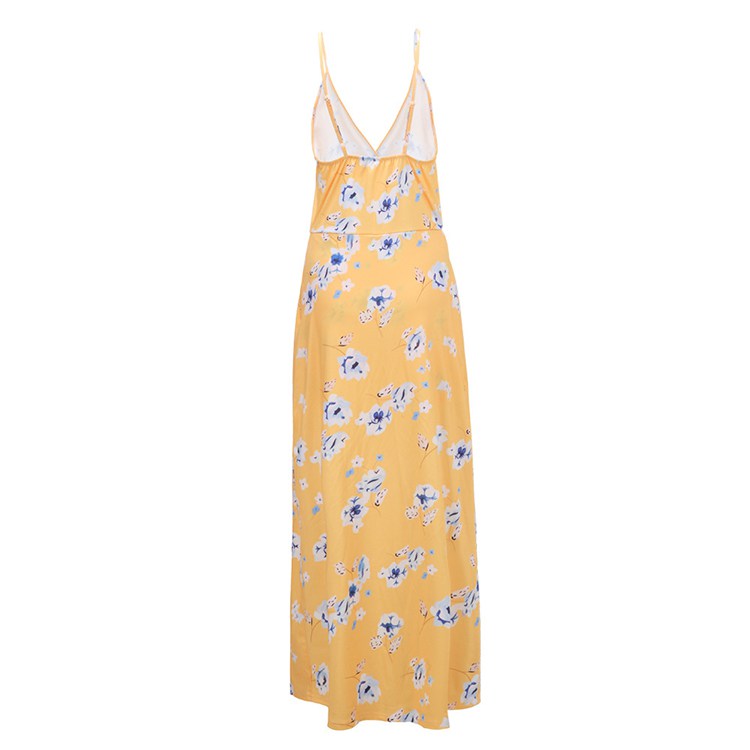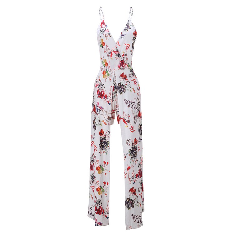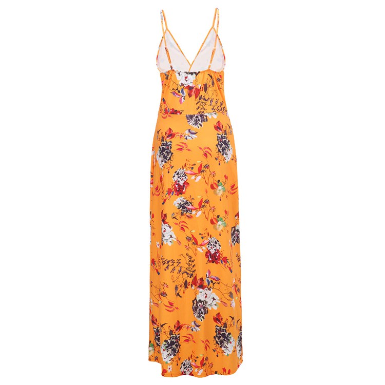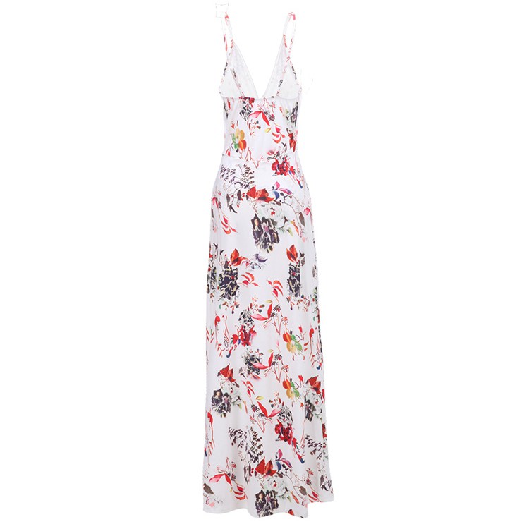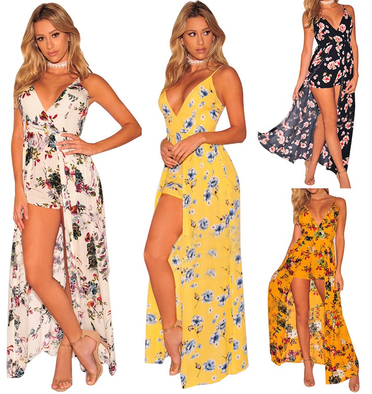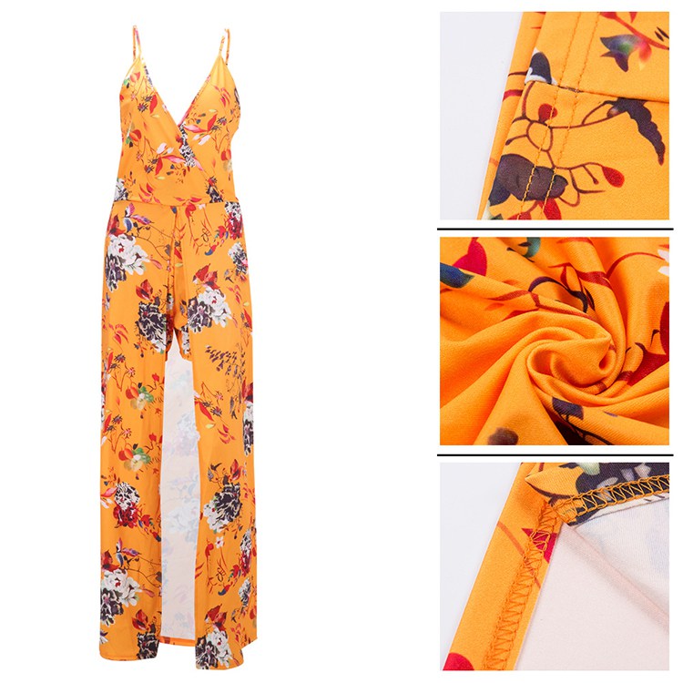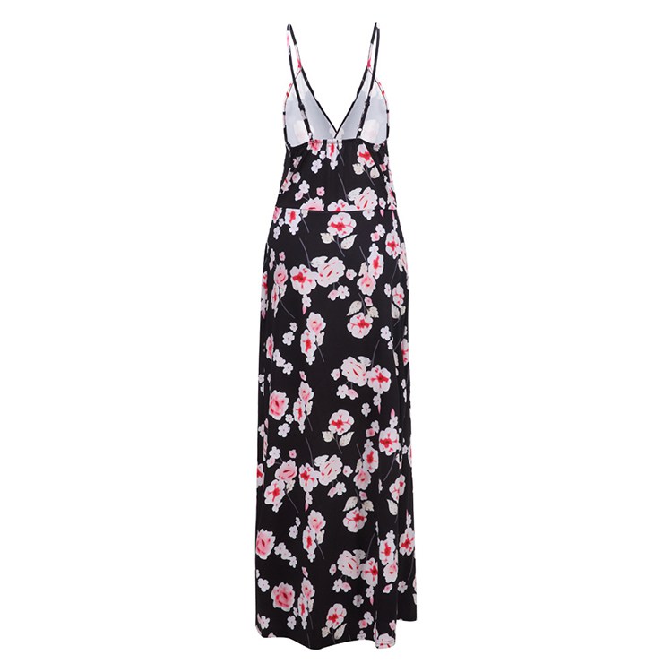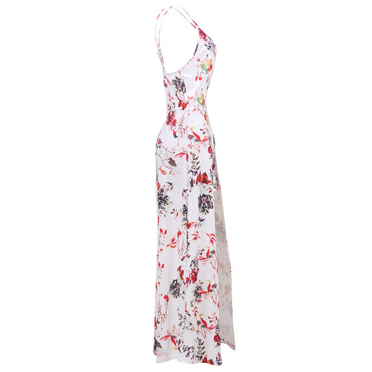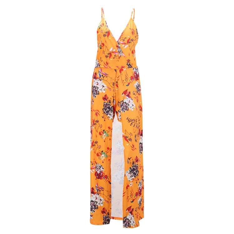 A maxi dress featuring an allover floral print, an off-center front slit, adjustable straps, and a surplice neckline.