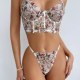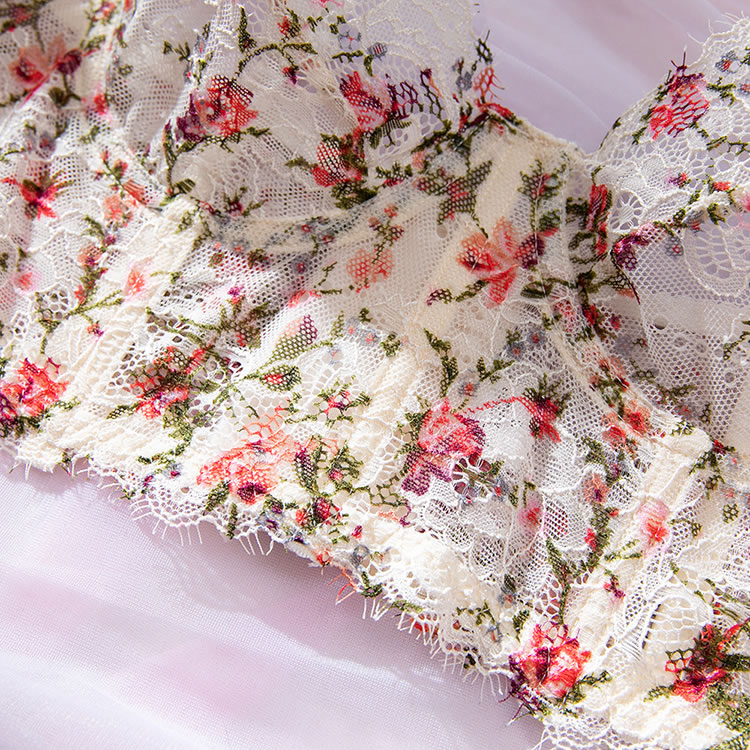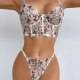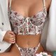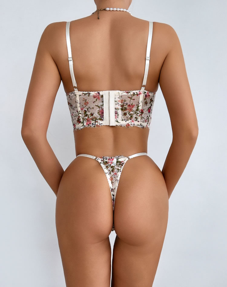 This floral lace lingerie costume features a structured underwire bra with vertical paneling, creating a bold yet feminine silhouette. The delicate floral pattern is layered over sheer mesh, giving it a vintage-inspired charm. Paired with a matching thong that follows the same design language, it's perfect for themed events, intimate nights, or adding a dramatic flair to any look. The thin white straps and clean edges enhance its elegant contrast against the vibrant florals.