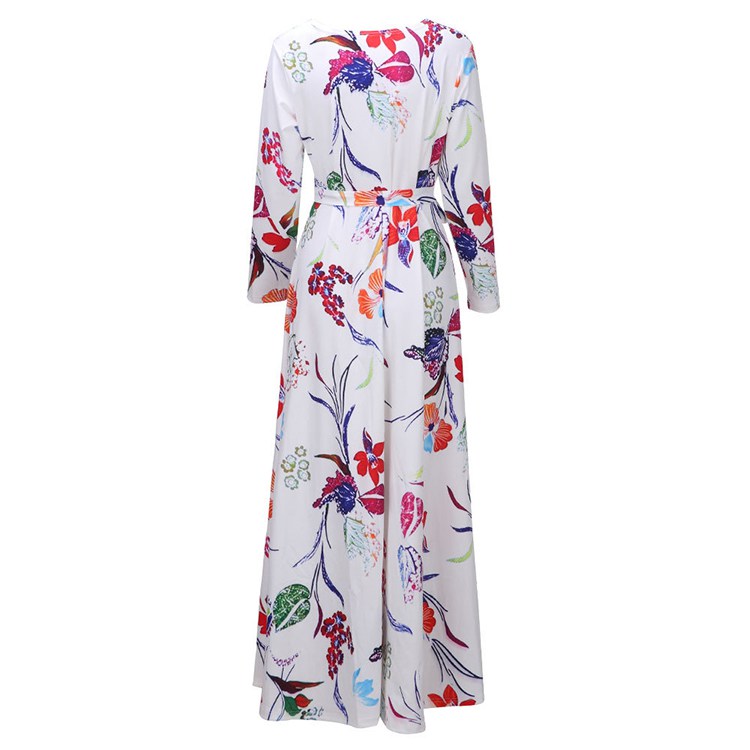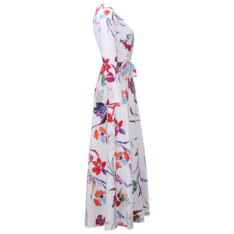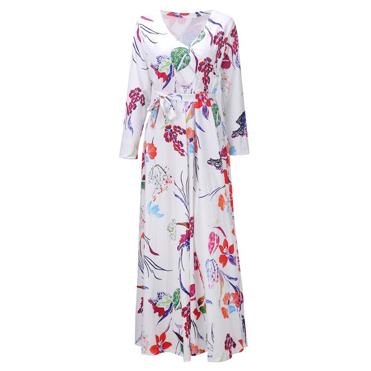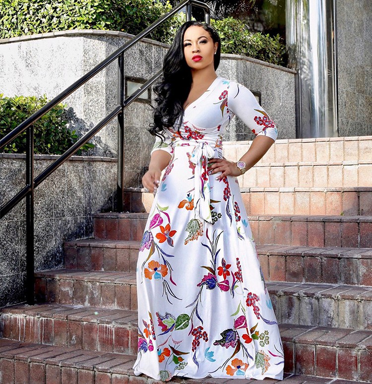 A wrap dress featuring an allover floral print, 3/4 sleeves, and a self-tie waist.