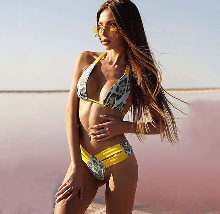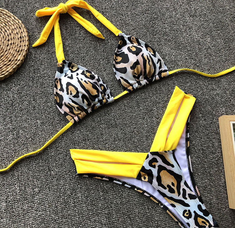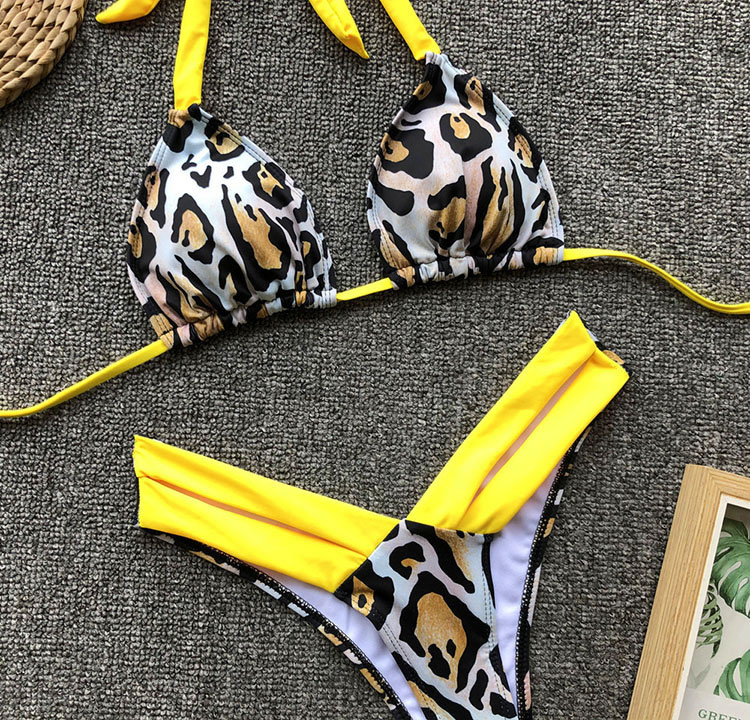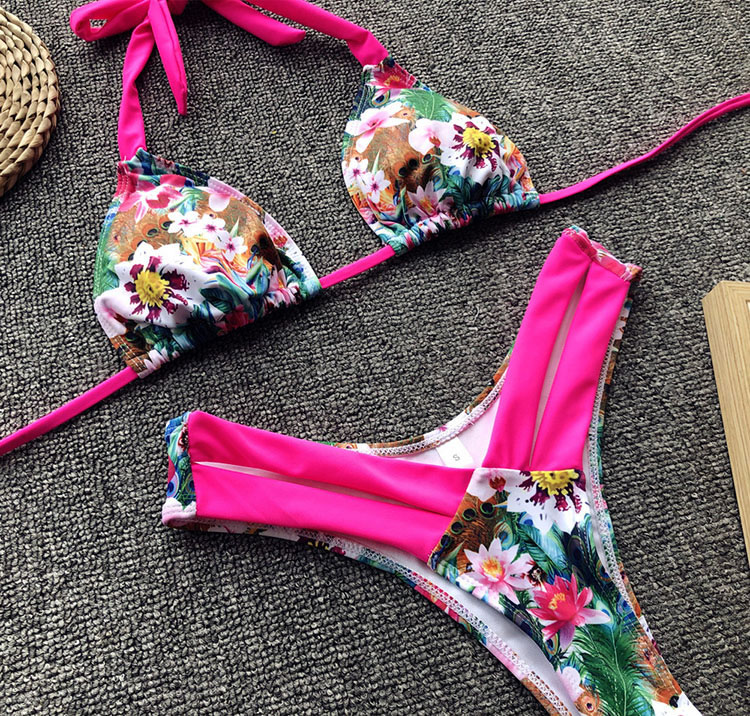 Fierce meets chic in this flirty bikini featuring triangle cups, halter straps, a tie back closure, and matching bottoms with a cheeky cut back.