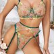 This eye-catching lingerie set features a vibrant floral pattern woven into sheer mesh fabric, framed by deep green satin trim for a bold contrast. The underwire bra offers structured support with thin adjustable straps and a back clasp closure. Paired with a matching thong and attached garter straps, it delivers a daring look that's both playful and confident. Perfect for making a statement during intimate moments or themed events.