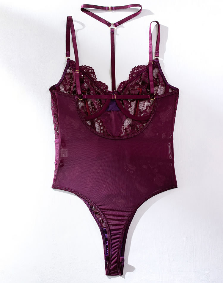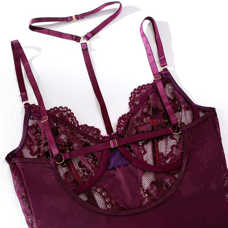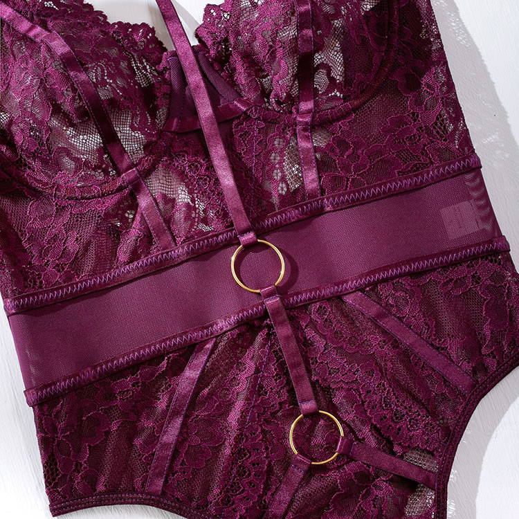 This exquisite deep purple lace bodysuit features intricate floral patterns, underwired cups for support, and a sultry satin belt that highlights the waist. Enhanced with strappy detailing and metallic ring accents, this piece exudes sophistication and bold sensuality, perfect for making a striking impression on special occasions.