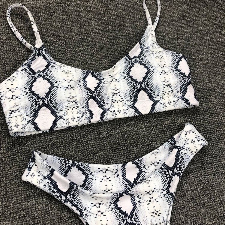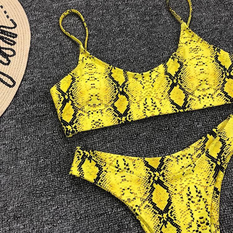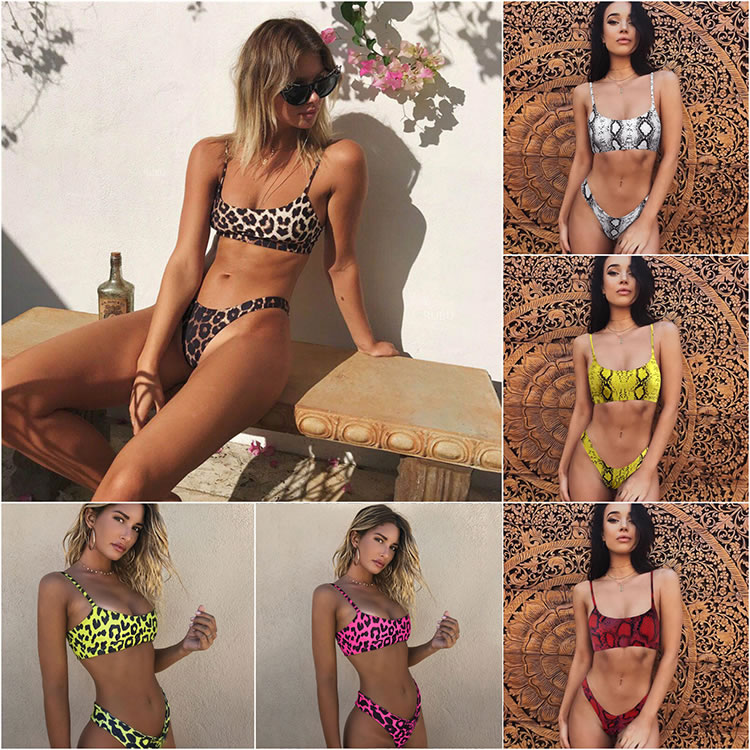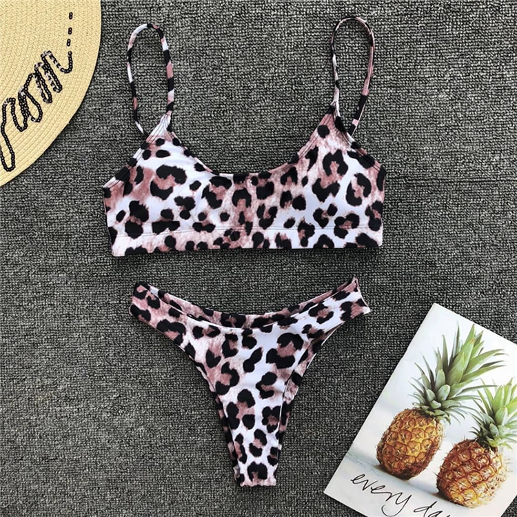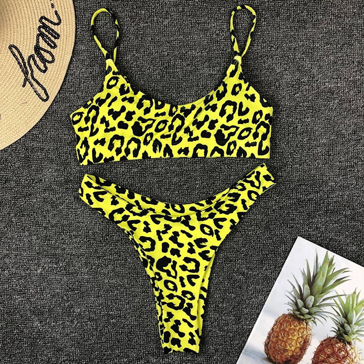 Sexy two piece bikini set featuring a bralette bikini swim top with adjustable shoulder straps, pad cups, stretchy band, matching with a high cut bikini thong bottom in cheeky fit. Allover in leopard printed.
