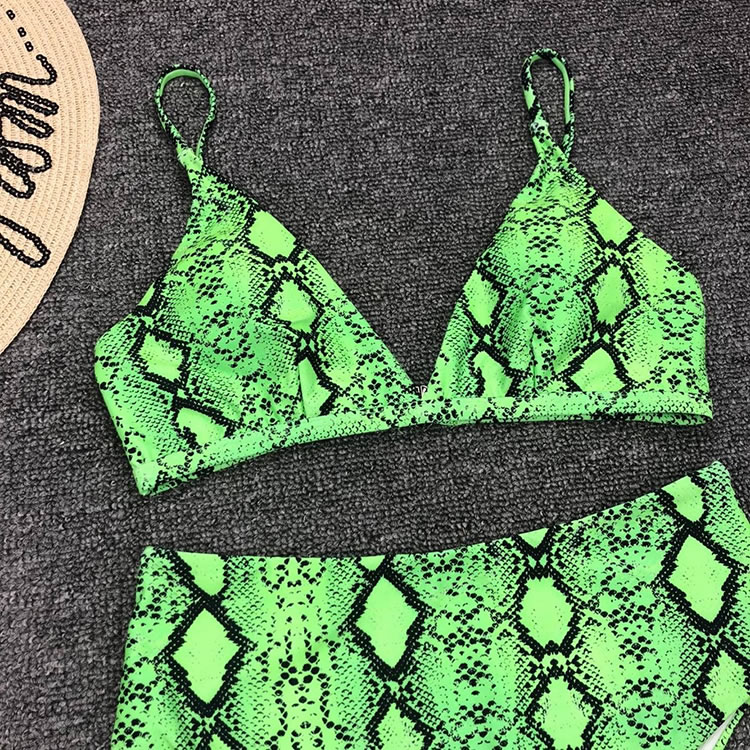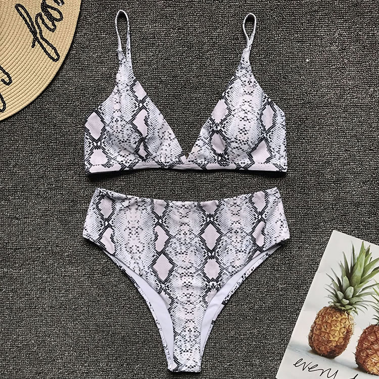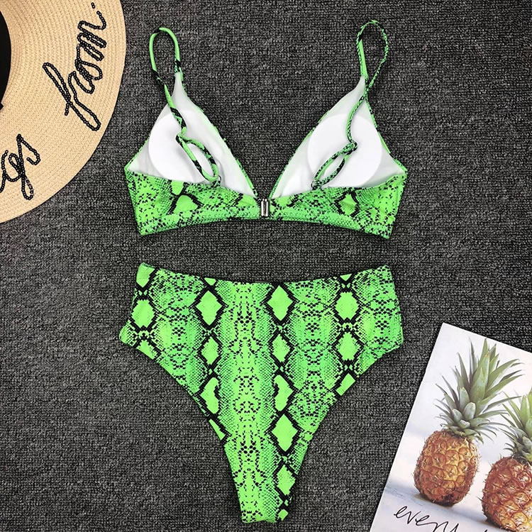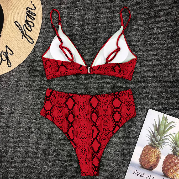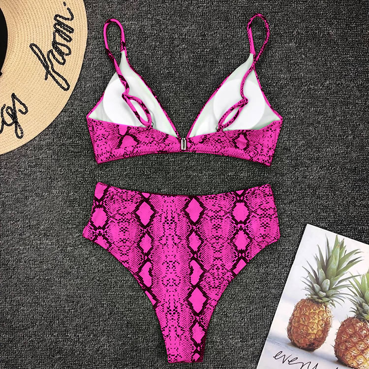 Seductive two piece bikini swimsuit featuring a triangle swim top with adjustable shoulder straps, detachable cups, slid closure on back, matching with a high waist bikini bottom in cheeky fit back. Allover in snake printed.