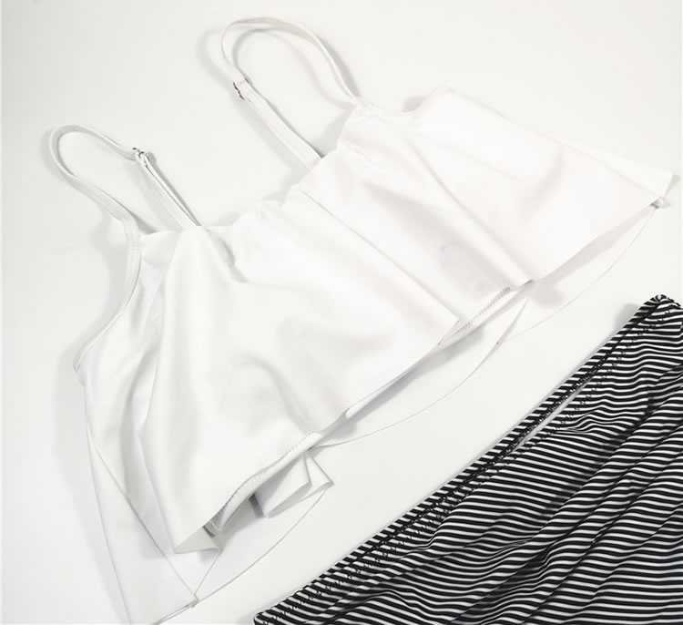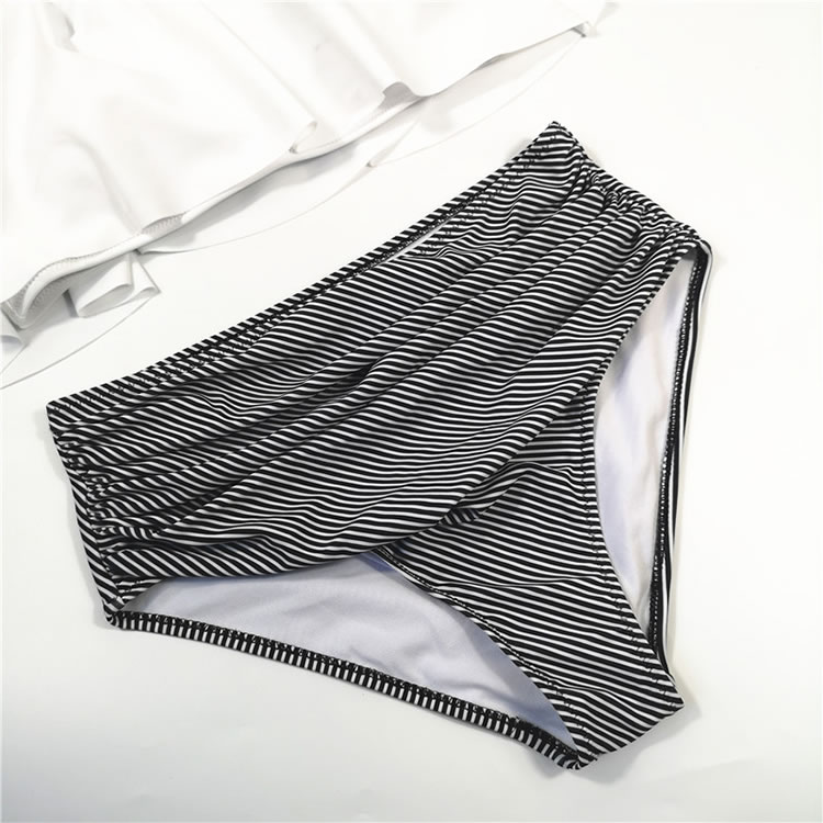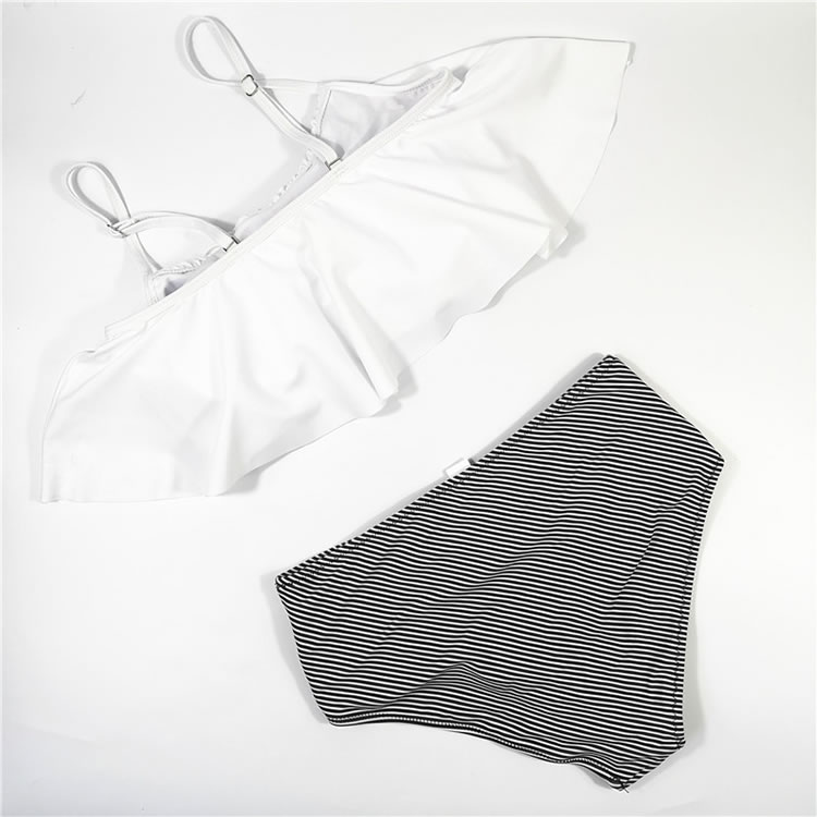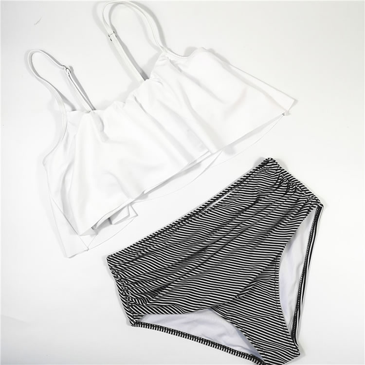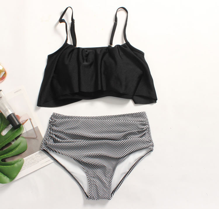 Flatter your figure in this cute bikini set featuring a square neckline, ruffled cups, adjustable spaghetti straps, and matching bikini bottom with a high waist, a wide ruched waist band, and a full back.