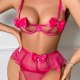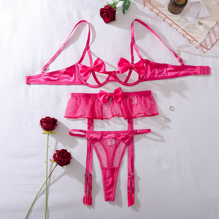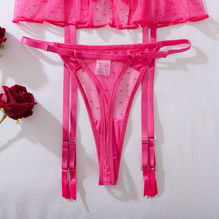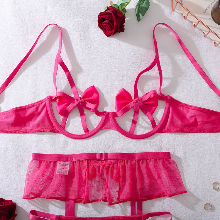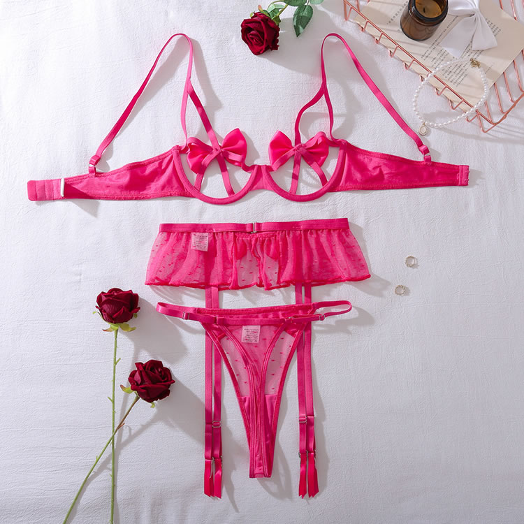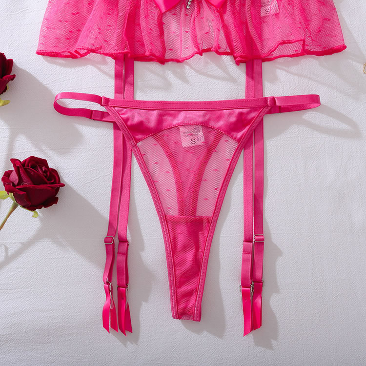 Infuse your lingerie collection with a burst of color and playful charm. This eye-catching set features a unique bra with satin bows and strappy details that create a captivating design. The matching high-waisted garter panty is adorned with a sheer, ruffled overlay and a central bow, offering a sweet yet seductive look. Finished with adjustable garter straps, this ensemble is perfect for making a fun and confident statement.
