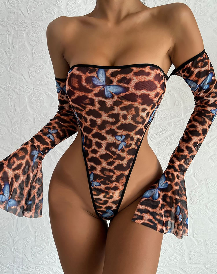 Make a statement with this striking leopard print bodysuit adorned with vibrant blue butterflies. The off-the-shoulder design and flared sleeves add a touch of elegance, while the high slit accentuates your curves. Perfect for those who love to embrace their bold side, this bodysuit is designed to make you feel confident and irresistible.