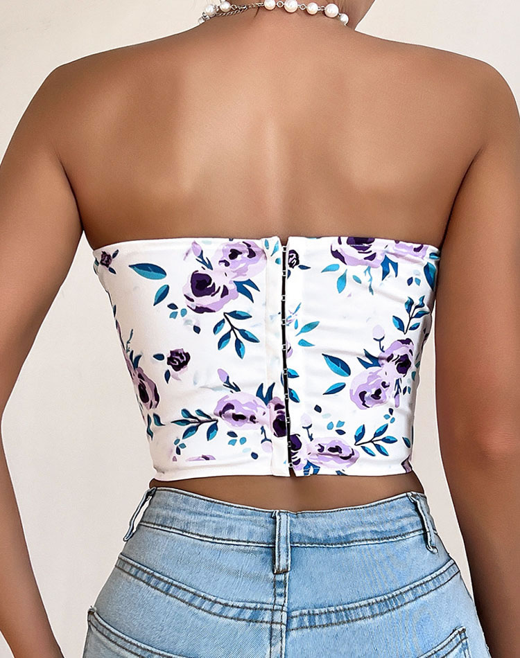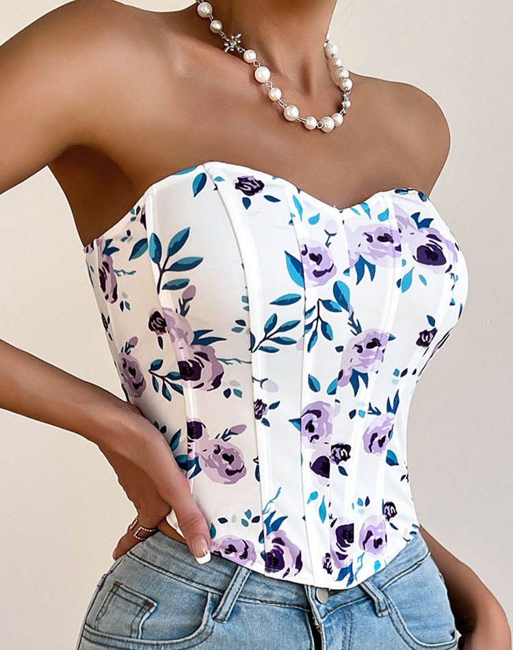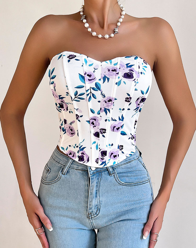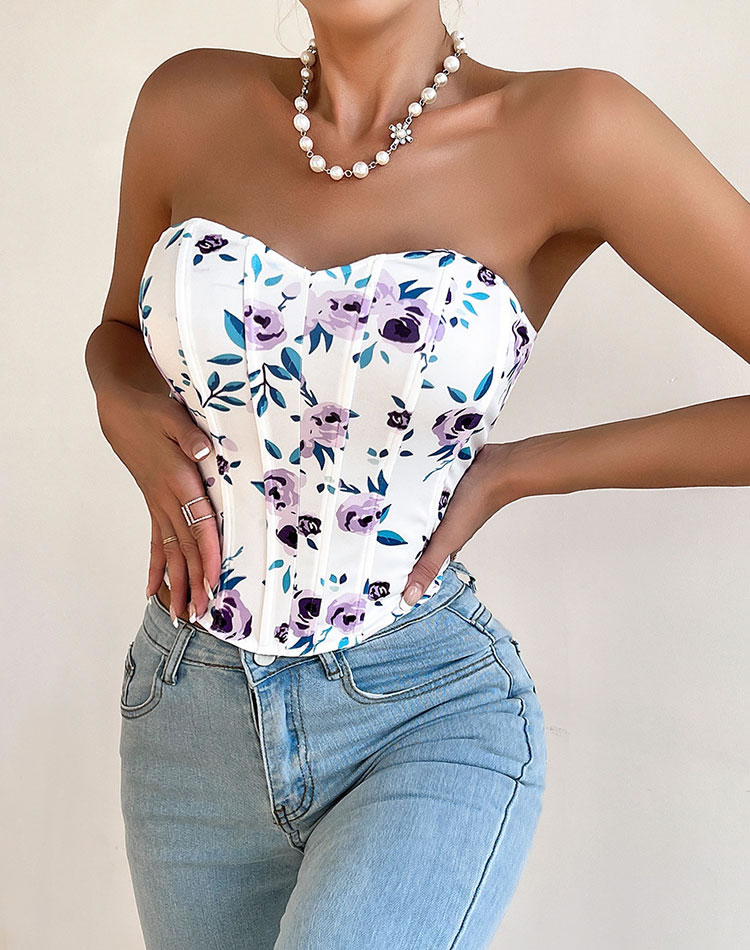 Elevate your wardrobe with this elegant floral bustier top. The sweetheart neckline and intricate floral print create a sophisticated yet playful look, ideal for those who want to make a statement.