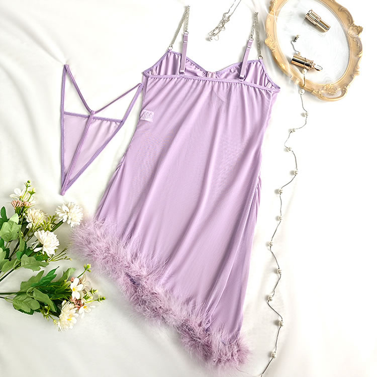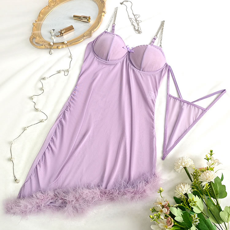 This elegant lavender lingerie dress features a smooth, semi-sheer fabric that hugs the body with a flattering fit. The sweetheart neckline is accented with a delicate bow at the center, adding a touch of romance. Thin adjustable straps provide support and style, while the hemline is trimmed with soft feather detailing for a playful, feminine finish. Designed to enhance curves, it’s perfect for intimate moments or themed events.
