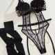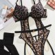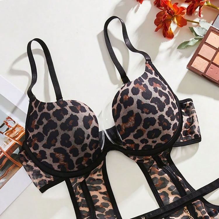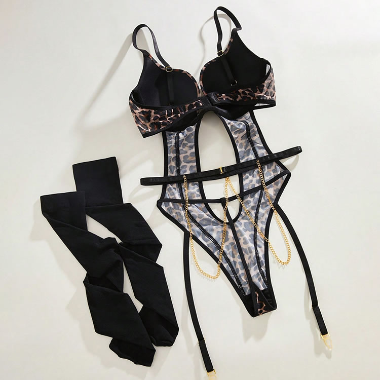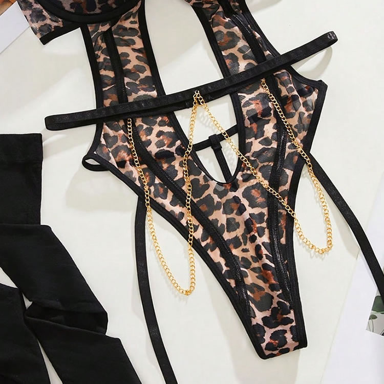 Unleash your wild side with this bold leopard print teddy, designed for the daring and confident. This piece features a striking animal print fabric contrasted with sleek black trim. The design is defined by its provocative cutouts and strappy details that create a captivating cage effect around the waist and hips. A delicate gold chain drapes across the front, adding a touch of metallic shine. The set includes matching garter straps and thigh-high stockings, completing this fierce and unforgettable look.