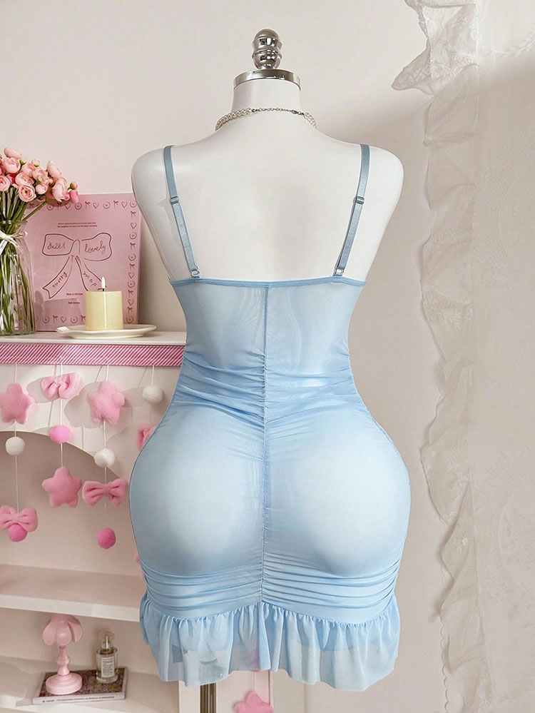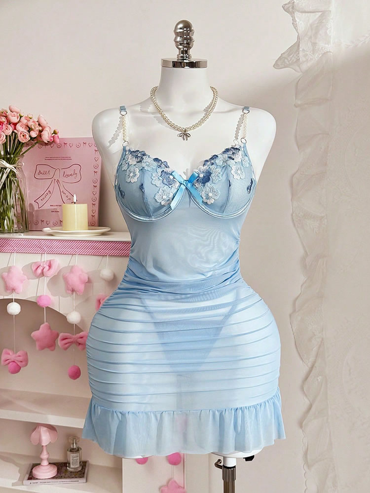 Drift into a dreamy state with this ethereal light blue chemise. Designed for comfort and style, this babydoll nightie features delicate floral lace appliqué on the bust, adding a soft, romantic touch. The sheer mesh fabric flows gently over the body, with subtle ruching at the waist to create a flattering, form-fitting silhouette. Finished with a sweet ruffle hem and adjustable spaghetti straps, this sleepwear piece is perfect for warm nights or adding a touch of innocence to your boudoir collection.
