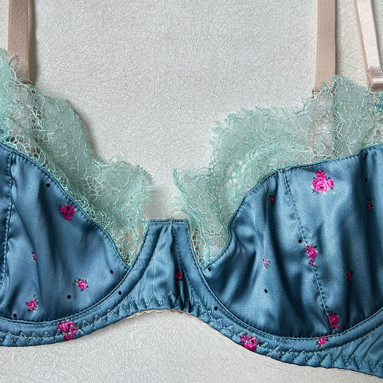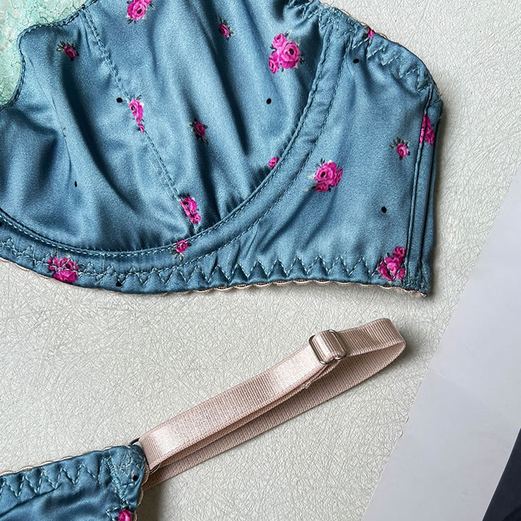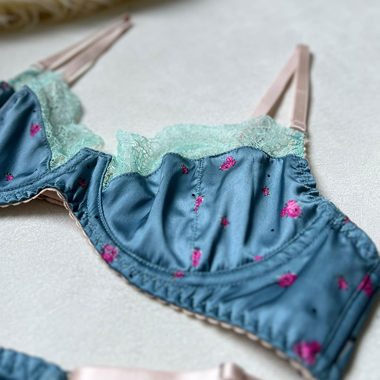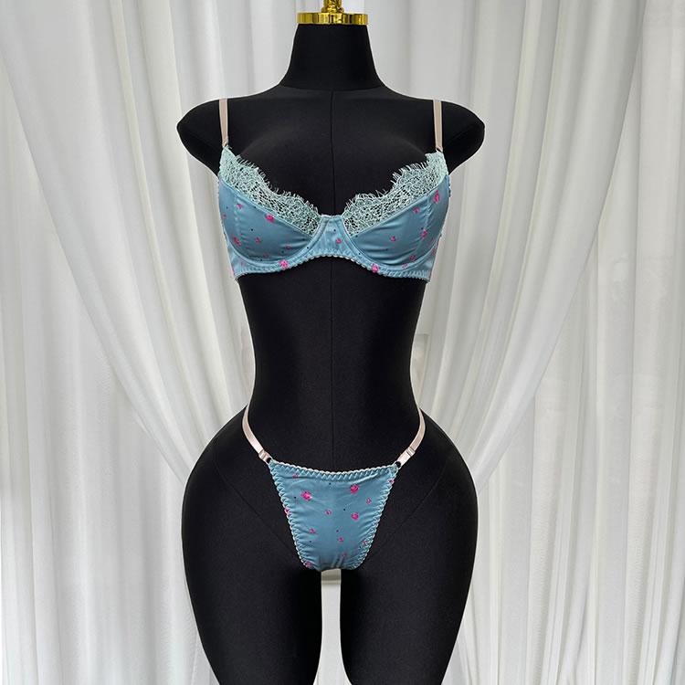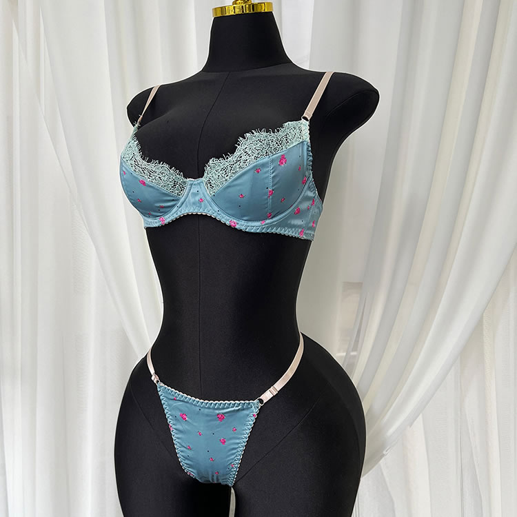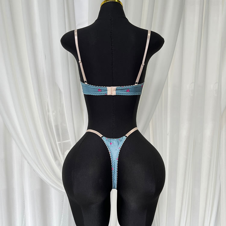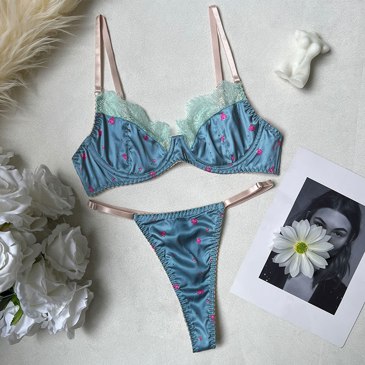 This sweet and sophisticated lingerie set features a soft sky-blue base adorned with tiny pink floral motifs for a playful yet refined look. The underwire bra is elegantly framed with scalloped cream lace along the cups and band, adding texture and contrast. Matching adjustable straps and a secure back closure ensure comfort and customization. The coordinating thong continues the design a minimalist cut, offering both style and ease of wear. Perfect for those who love romantic prints and gentle color palettes in their intimate apparel.