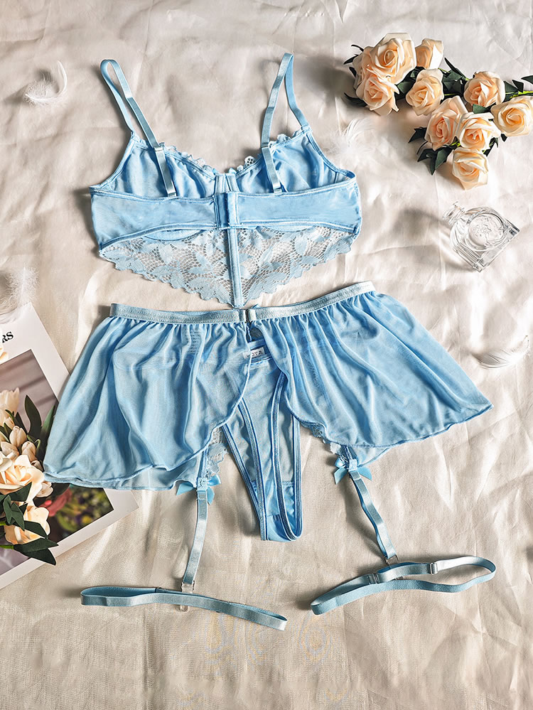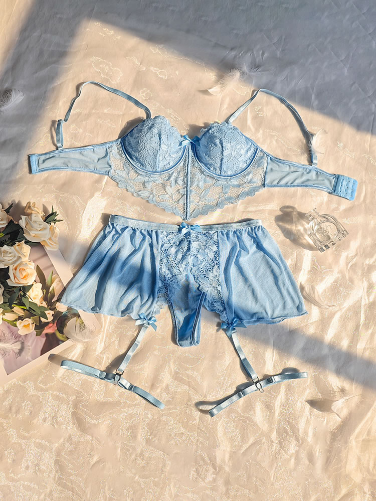 This charming light blue lingerie set features a delicate lace bra with floral detailing and a sweet bow at the center, offering both support and soft femininity. The matching high-waisted skirt is made of sheer mesh with lace trim and includes garter straps that attach to thigh bands, adding a vintage-inspired touch. Designed with a flirty silhouette and a back clasp closure, it’s perfect for creating a dreamy, romantic look that feels both playful and poised.
