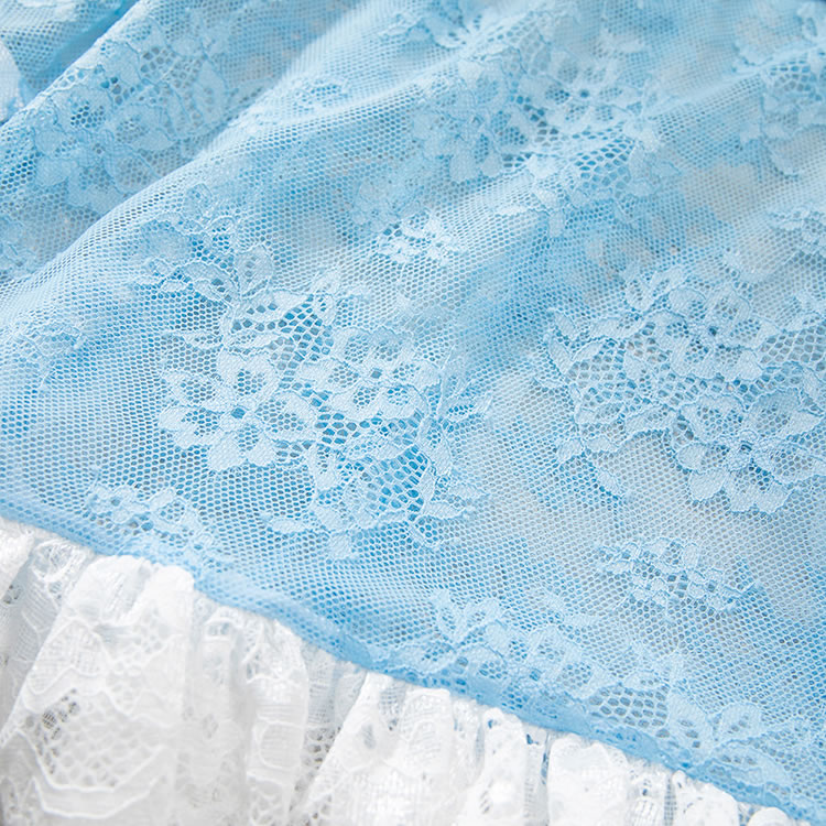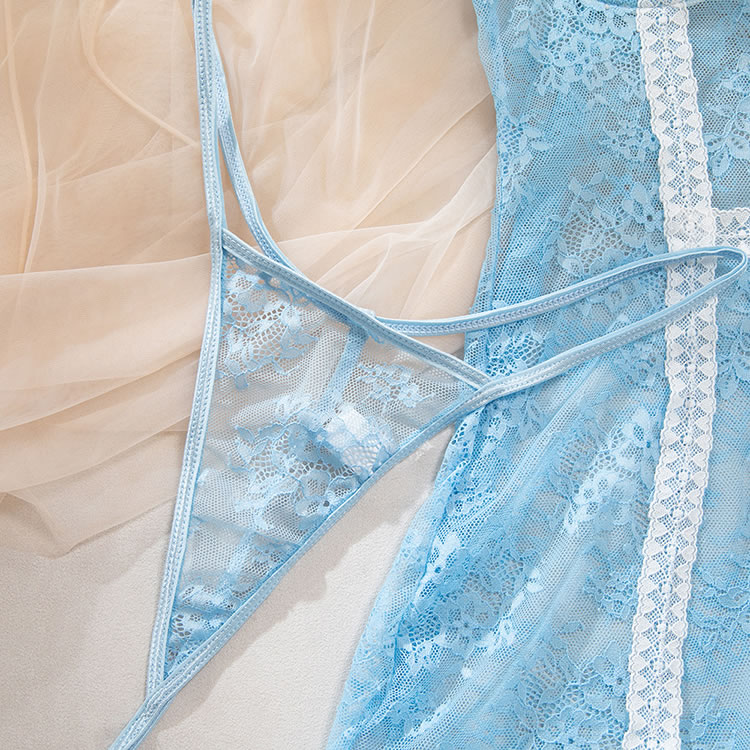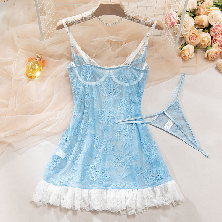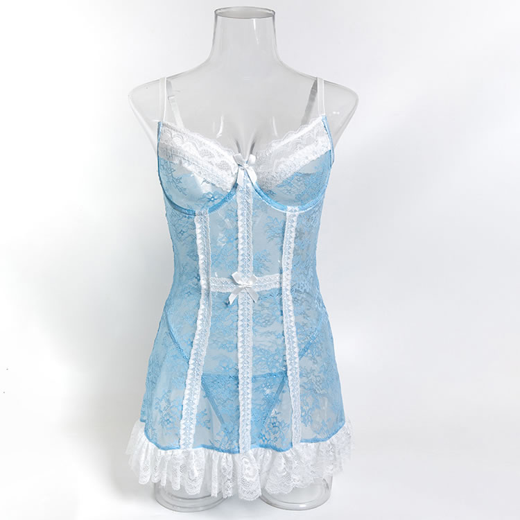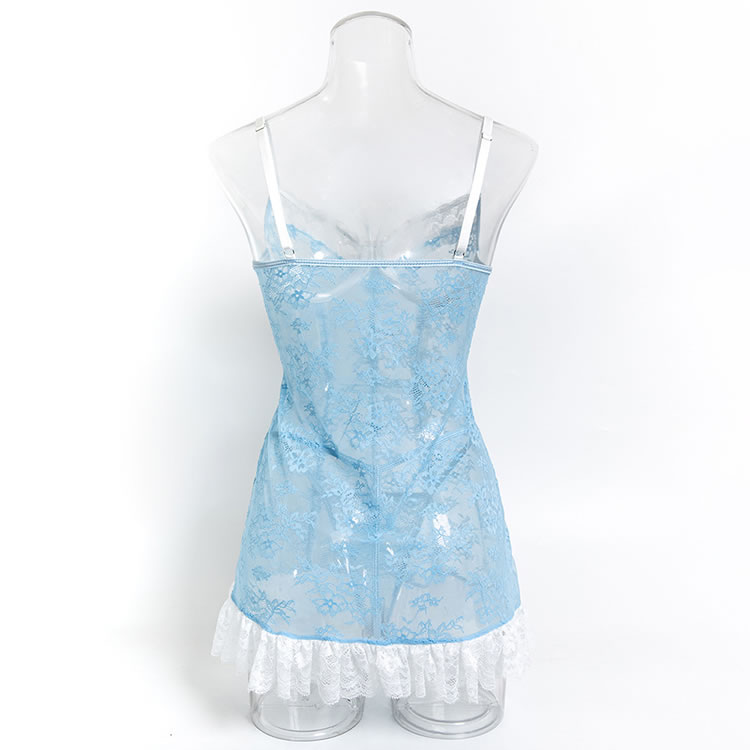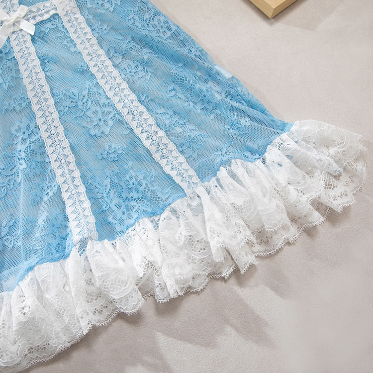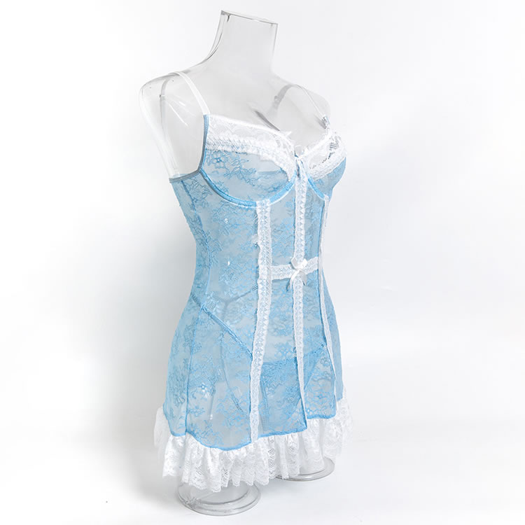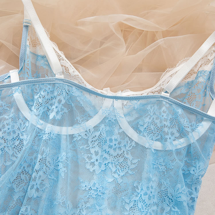 This delicate light blue lingerie dress combines sheer mesh with intricate floral lace for a romantic and feminine look. The fitted silhouette features a corset-inspired front with vertical lace panels and a bow detail at the center, creating a structured yet soft appearance. Thin adjustable straps offer comfort and support, while the back is finished with a clean, open design that highlights the shoulders and spine. The skirt ends in a flared white lace trim, adding a playful touch of vintage charm. Perfect for intimate evenings or special occasions, it blends elegance with a hint of playfulness.