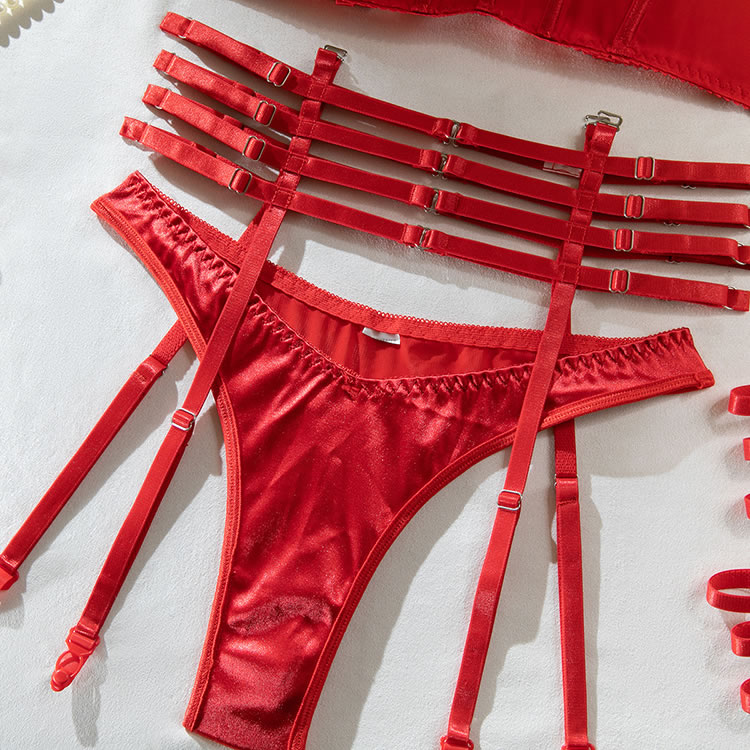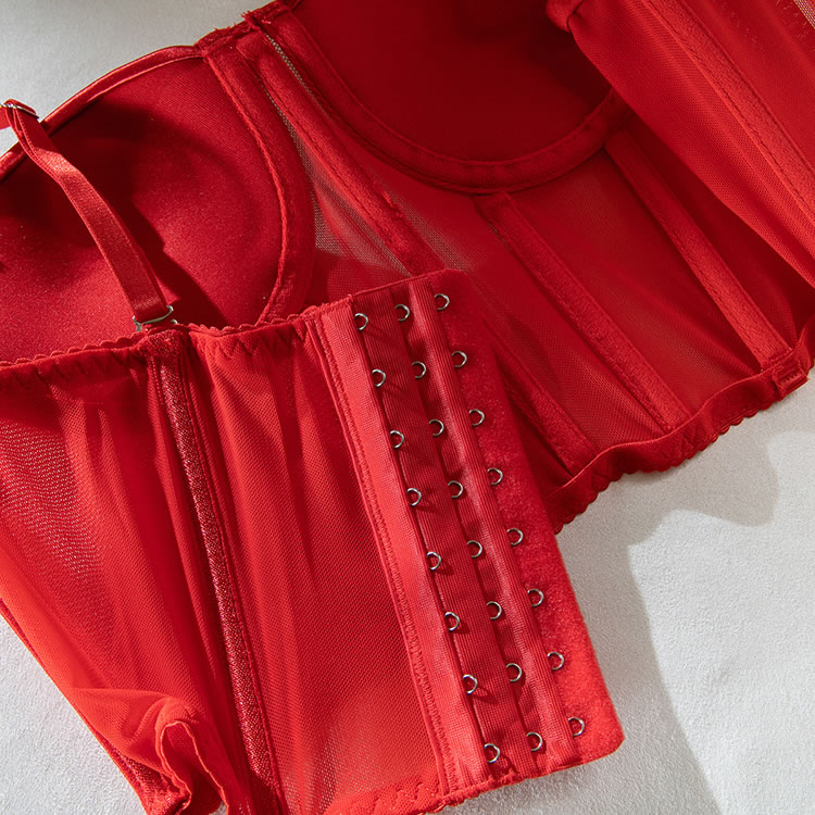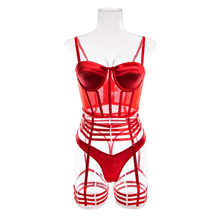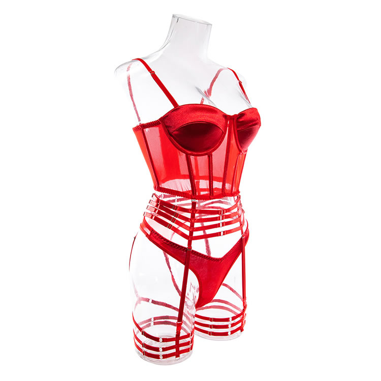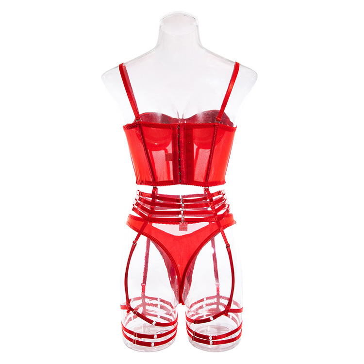 Captivate your lover in this stunning bustier set featuring soft cups, adjustable spaghetti straps, a sheer mesh bodice, a hook and eye back closure, a matching high waisted garter belt with adjustable garter straps, wraparound leg garters, and a matching panty.