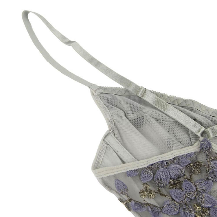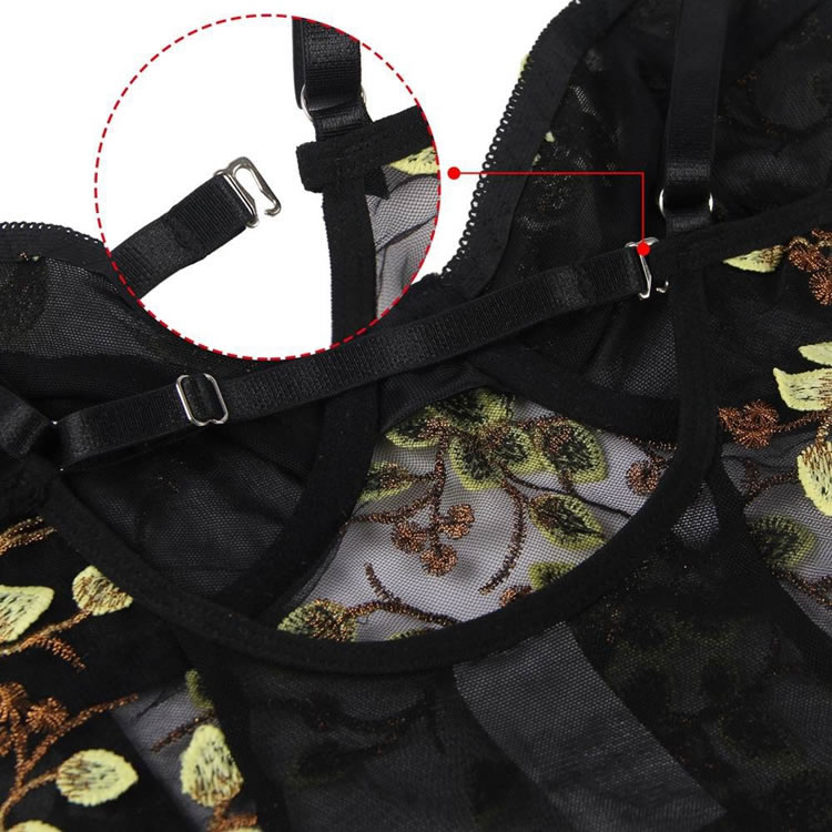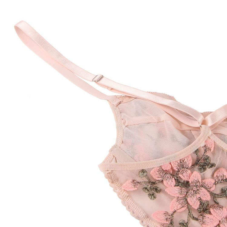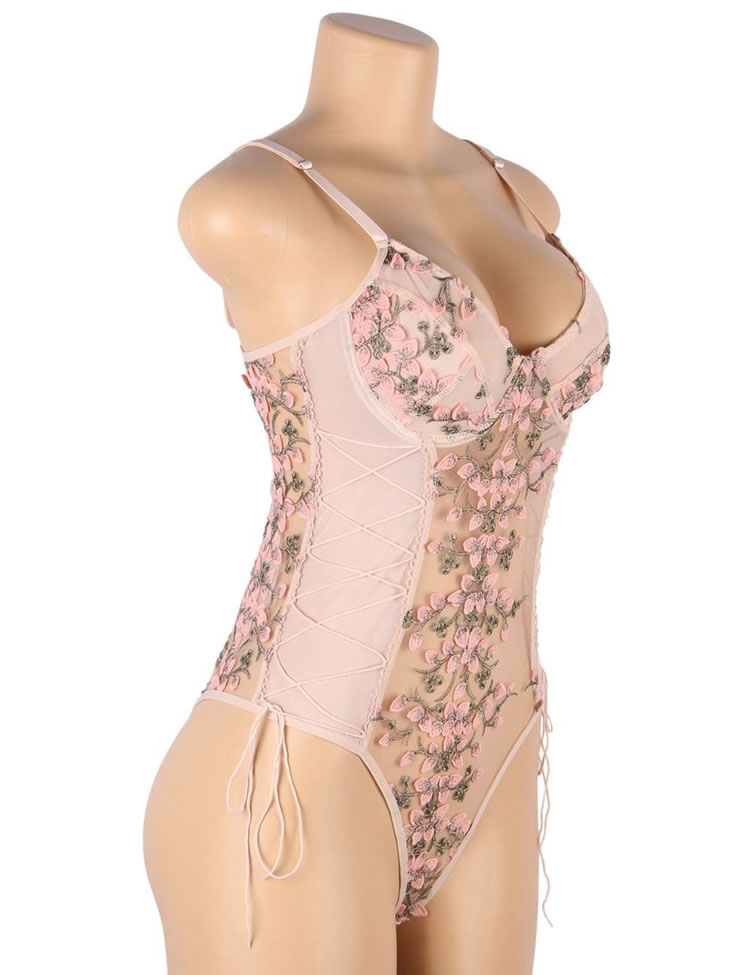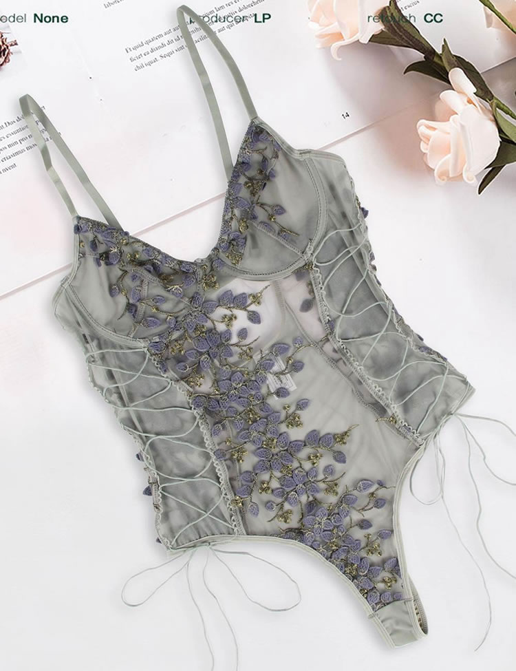 Tell your babe not to mesh with your heart in this sexy teddy featuring soft mesh underwire cups with floral appliques, adjustable spaghetti straps, a hook back closure with a keyhole, and a cheek cut back.