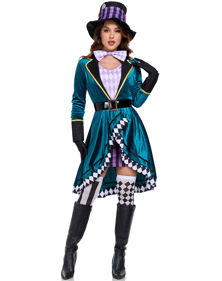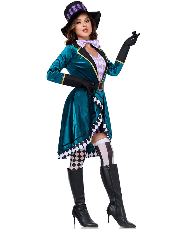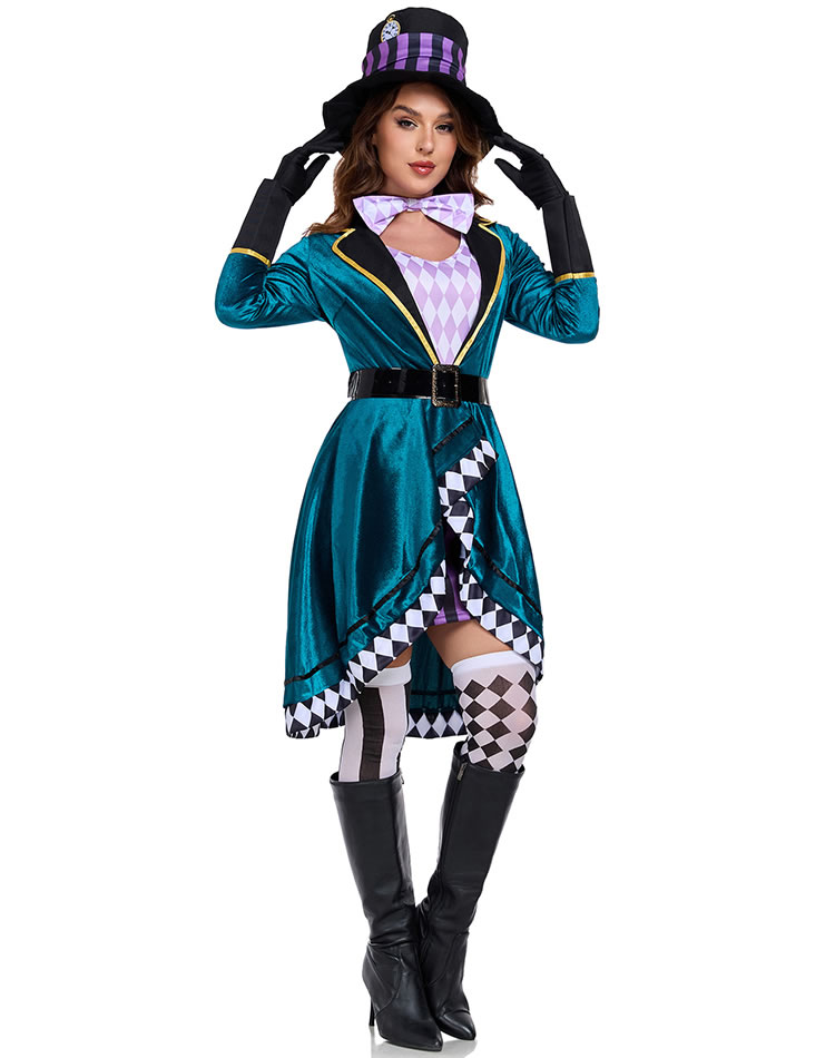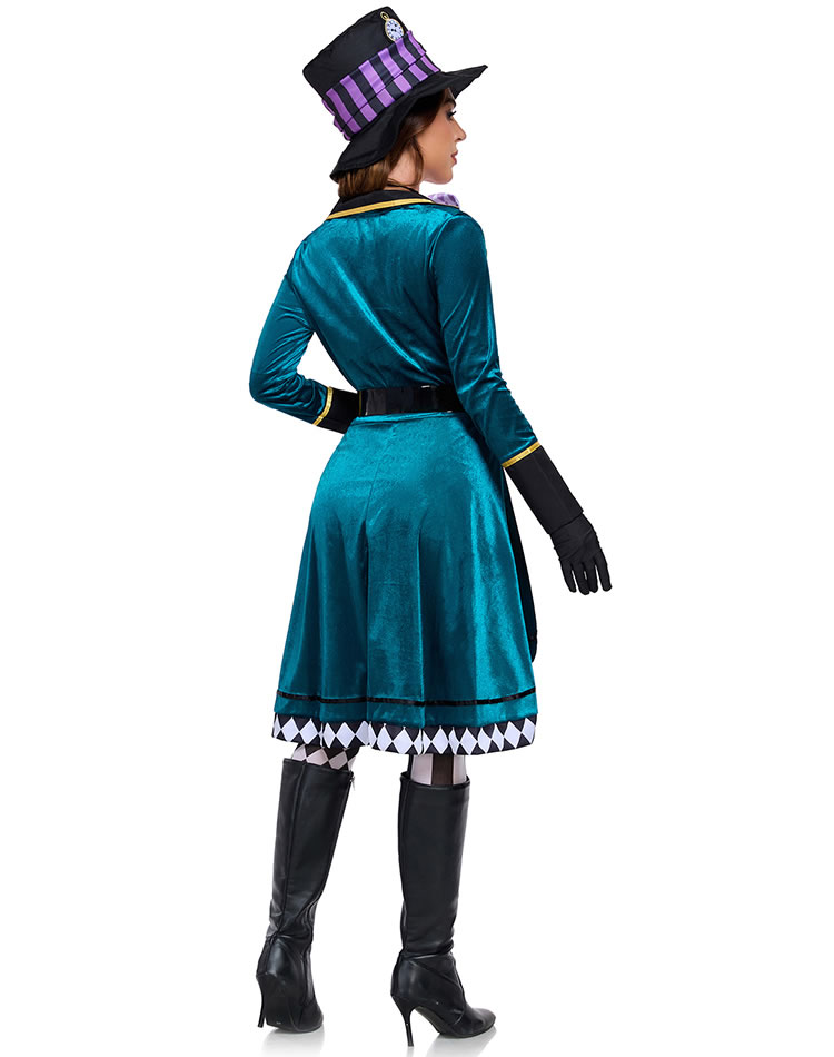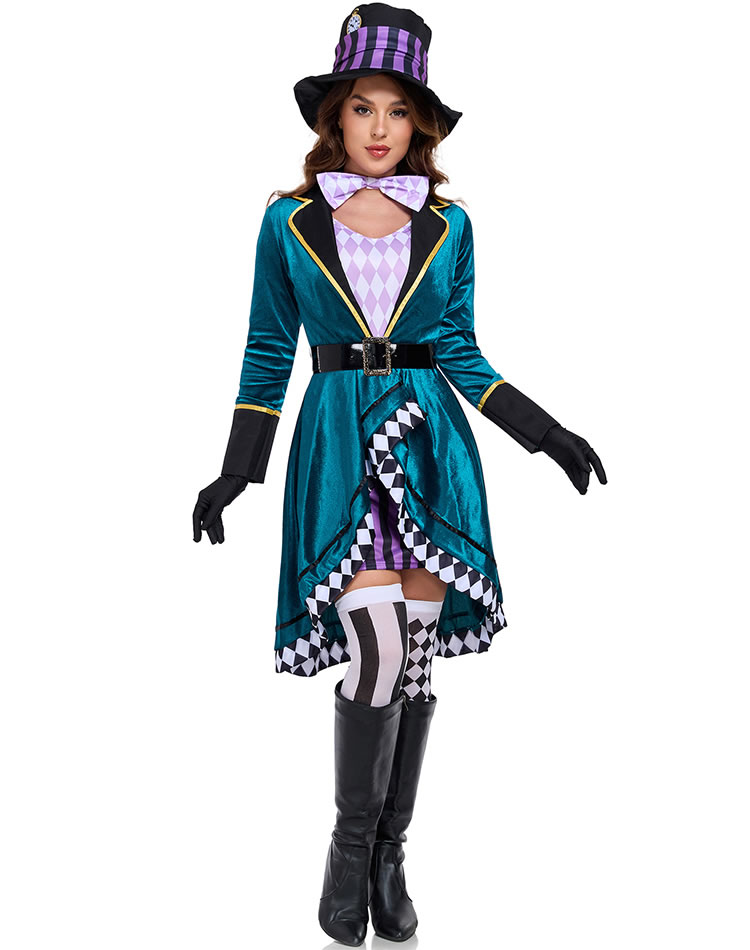 Step into the fantastical world of Wonderland with this eye-catching Mad Hatter costume. Featuring a rich teal velvet coat with a high collar, gold trim, and asymmetrical hemline, it's paired with a bold purple and black checkered top hat and matching bow tie. The outfit includes black gloves, and a playful checkerboard pattern along the skirt edges. Perfect for themed parties, Halloween, or cosplay events, this ensemble brings eccentric charm and theatrical flair to any occasion. (Striped knee-high socks not included)