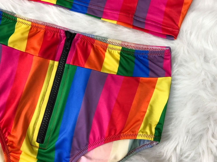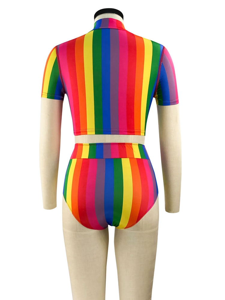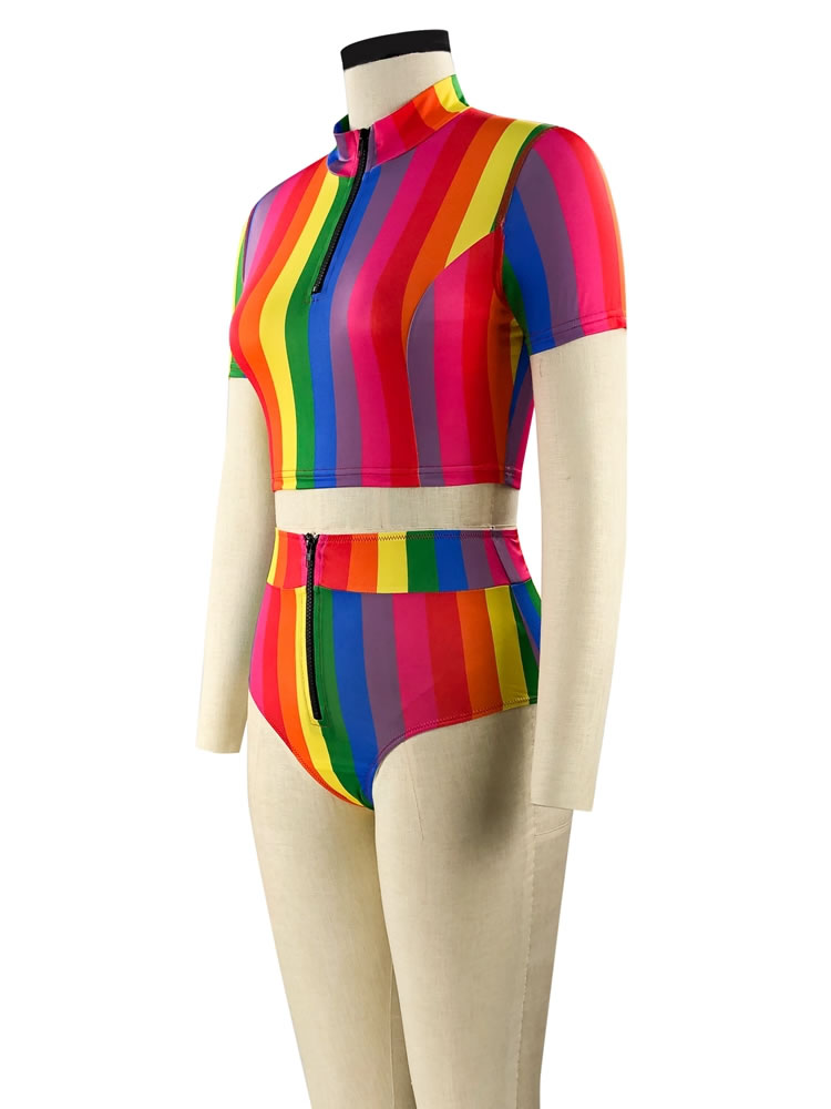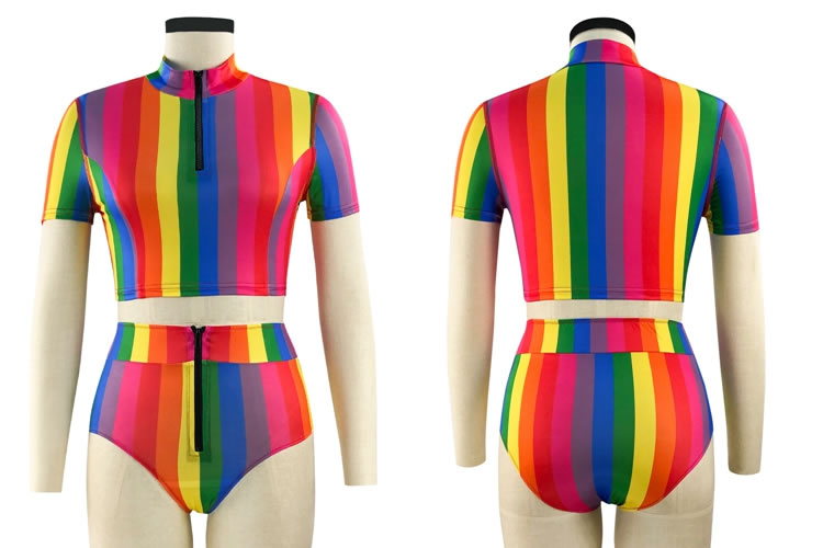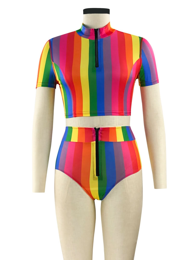 Aren't you looking Jet ski chic? Make an impression in this sporty two piece swimsuit featuring a low cut V-neckline with functional zippers accent, short sleeves, and matching bottoms with a high waist, and a cheeky cut back.