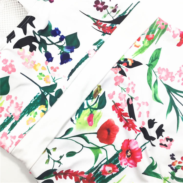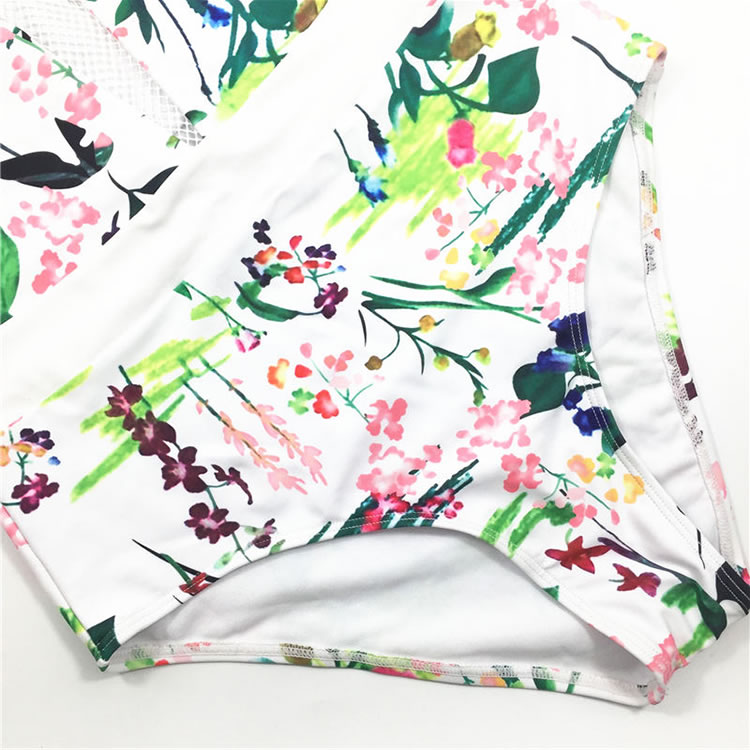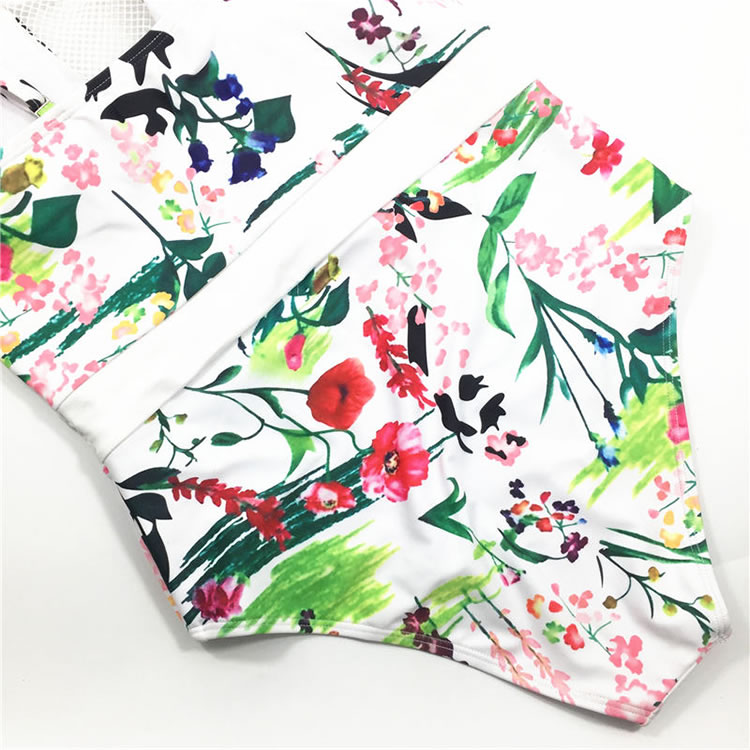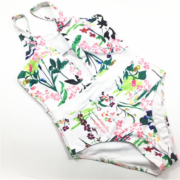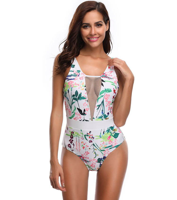 Turn heads in this sexy swimsuit featuring a plunging V-neck with a fishnet neckline, adjustable shoulder straps, an allover flower printed design, a white waist, and a cheeky cut back.