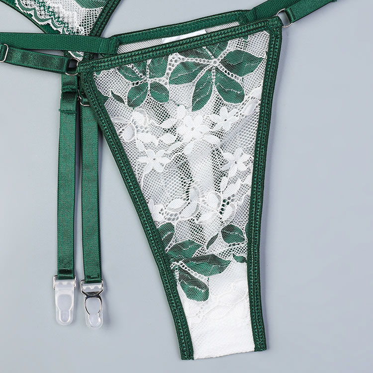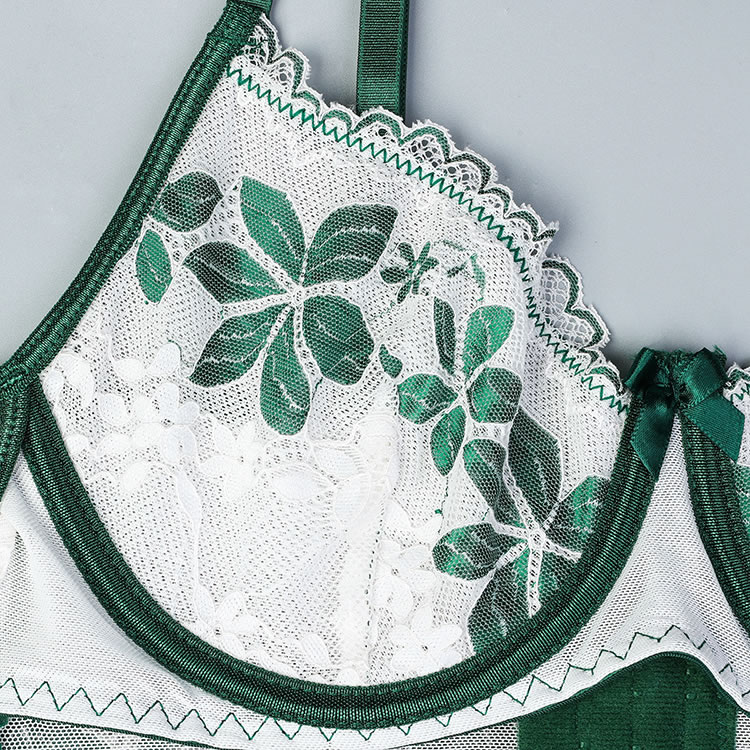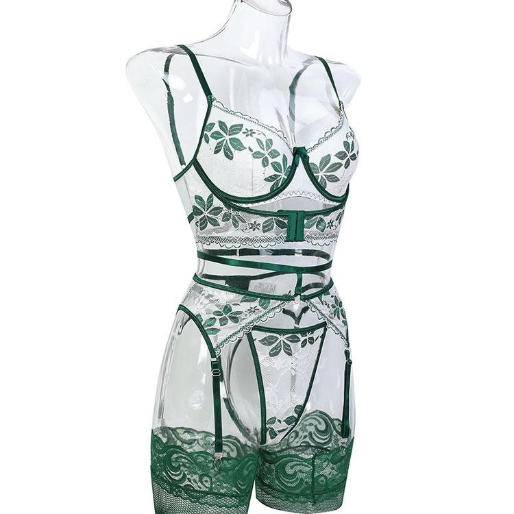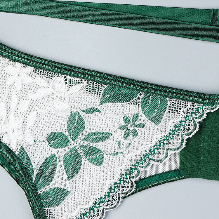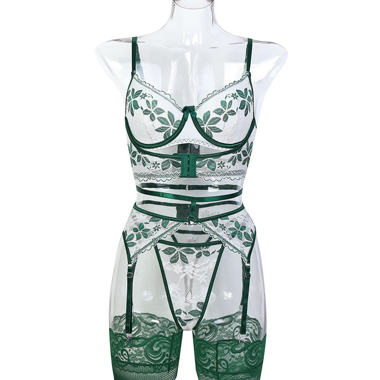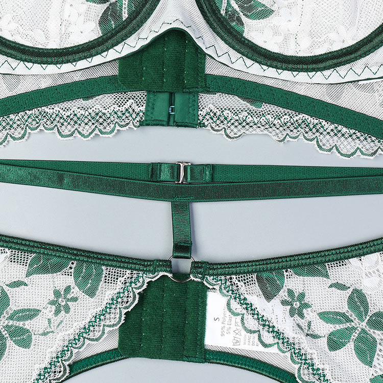 Indulge in desire with this stunning seduction bra set, featuring soft lace underwire cups for a delicate yet daring look. Adjustable spaghetti straps and a hook and eye back closure provide a customized fit, while the matching high-waisted garter belt with adjustable garter straps adds a seductive edge. Paired with a matching thong panty and thigh-high stockings, this set is designed to ignite passion and crave your lover's touch.