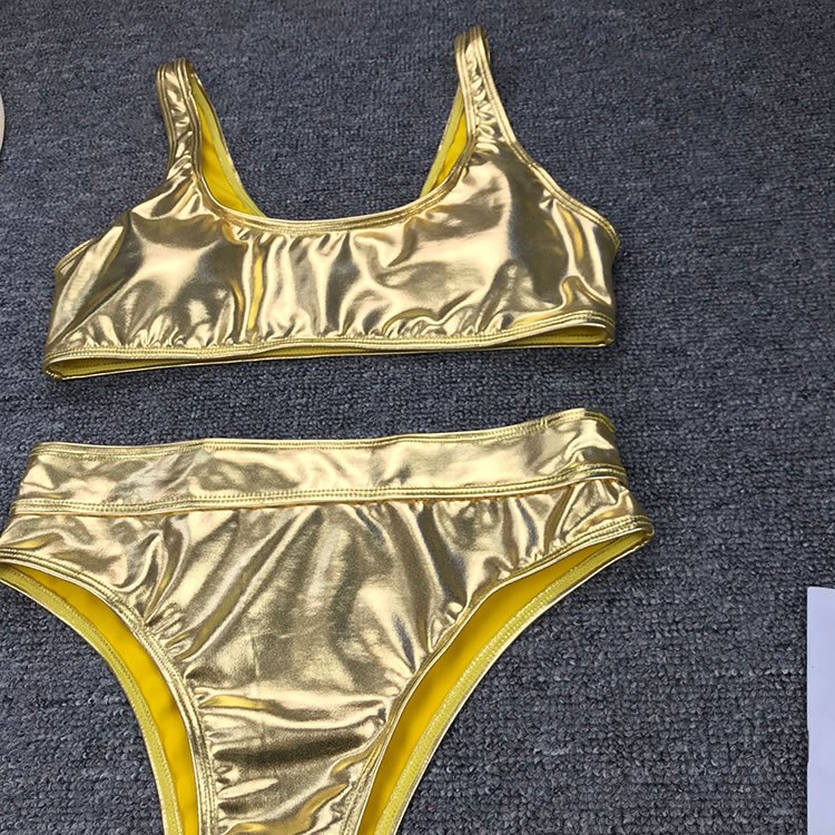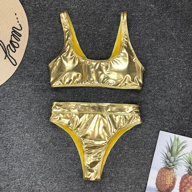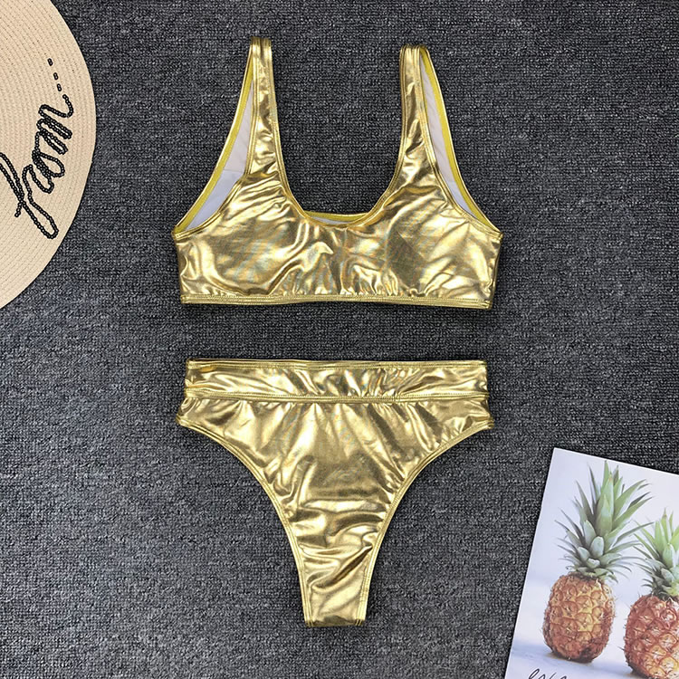 Hit the high fashion scene in this exclusive bikini swimsuit featuring a scoop neckline, shoulder straps, a metallic sheen, a pullover style, and a matching bikini bottom with high cut sides, and a cheeky cut back.