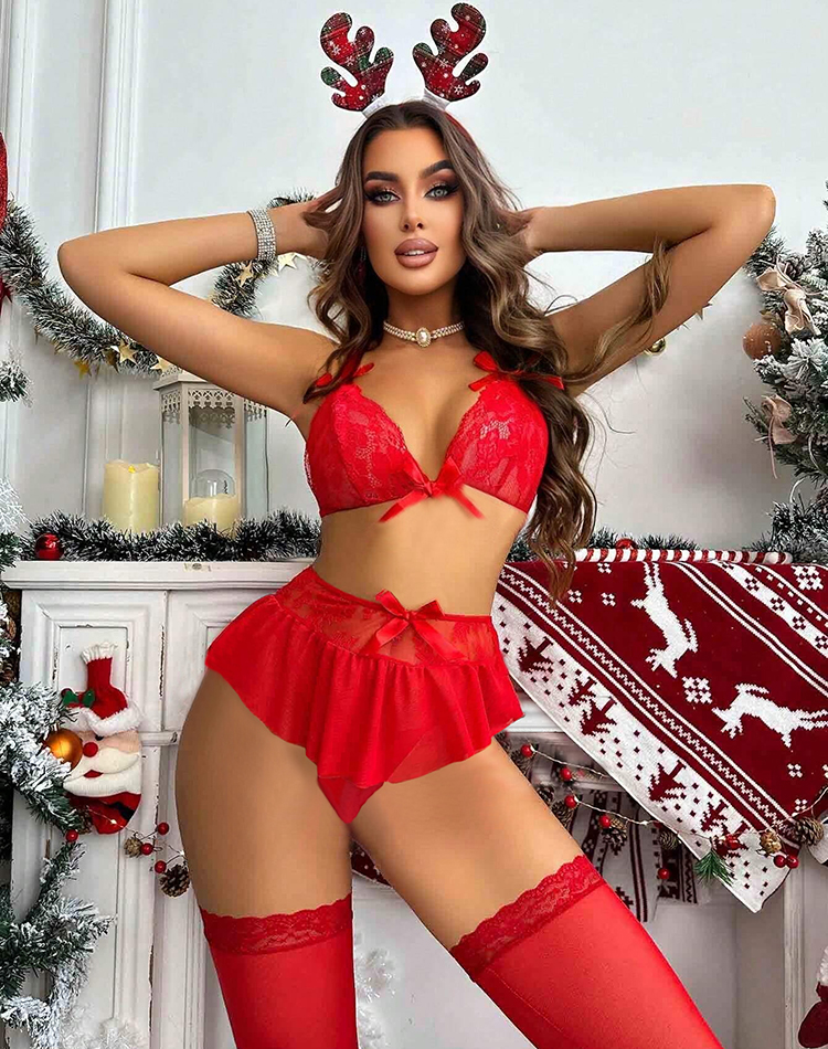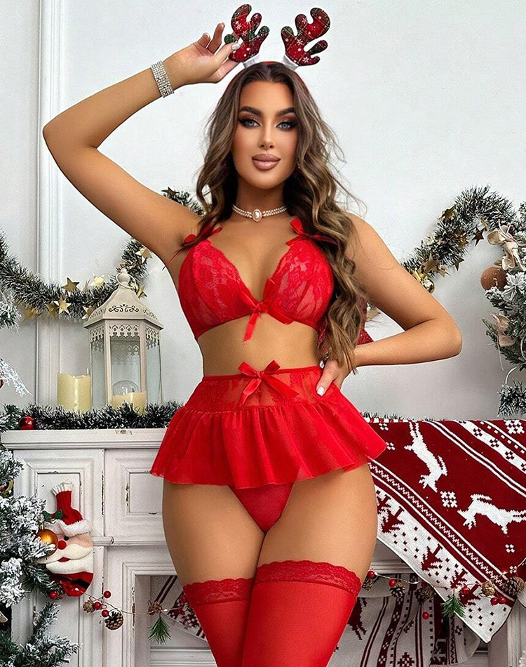 Have you been naughty or nice this year? Travel to the North Pole and seduce Santa in this Mrs. Claus lingerie costume featuring a red lace bra with sheer lace cups, spaghetti straps, a back tie closure, a matching mini skirt, and a matching thong panty. (Headpiece And Thigh high stockings not included.)