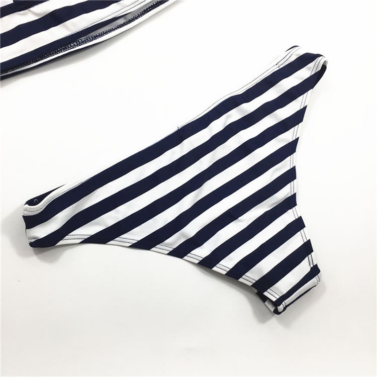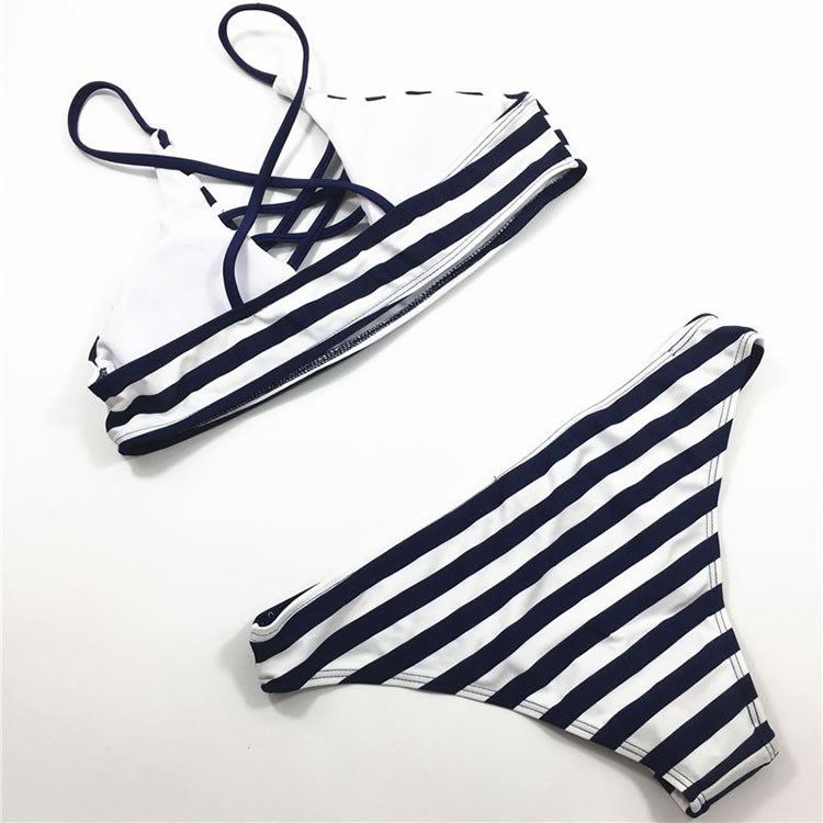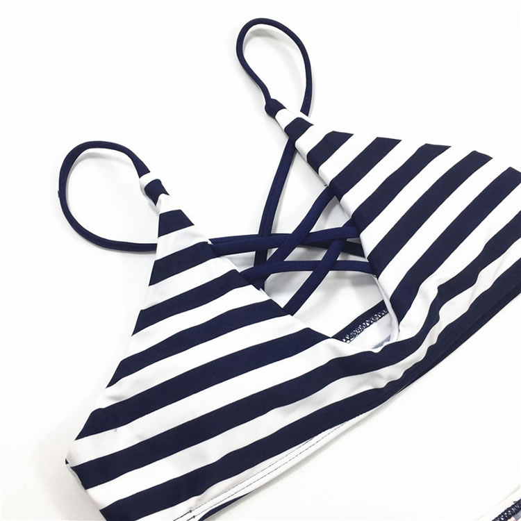 Lounge in the sand in this sexy navy bikini set featuring a white and blue striped top, a deep scoop neckline with criss-cross detailing, a criss-cross spaghetti straps, a matching panty with a cheeky cut back.