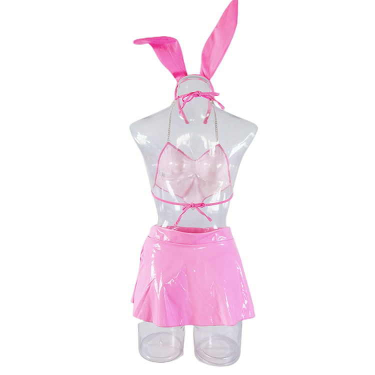 Ultra sexy meets sophistication? We're all ears. The garden party is calling your name in this No Bunny Knows costume featuring a wet look bra top, halter straps, a tie back closure, bunny ears, and a matching high waisted skirt.