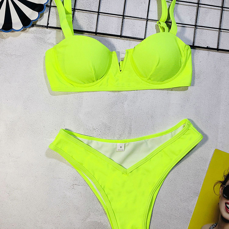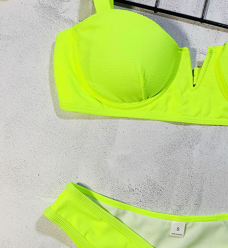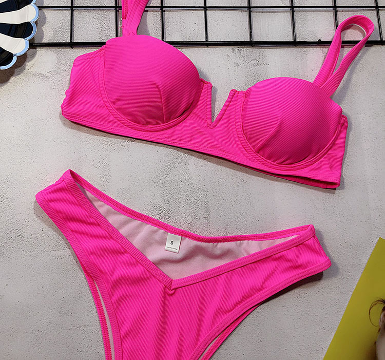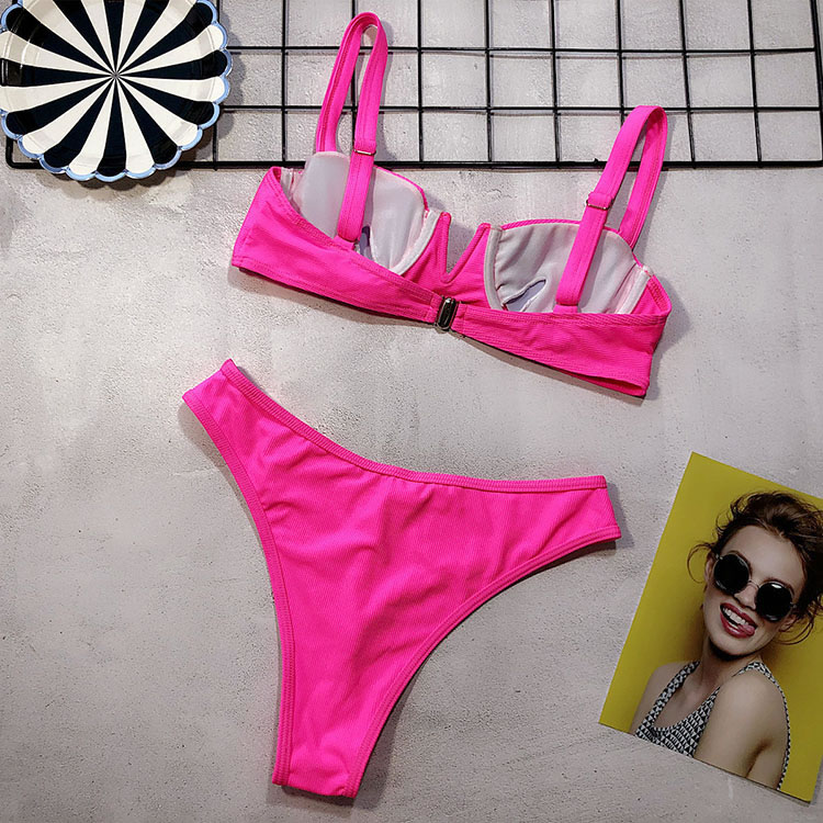 Flirt in the heat in this exclusive bikini set featuring a padded swim top with underwire cups, adjustable shoulder straps with slid closure, matching bottoms with a low cut front, high cut sides, a cheeky cut back,