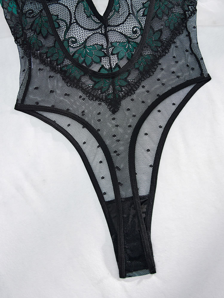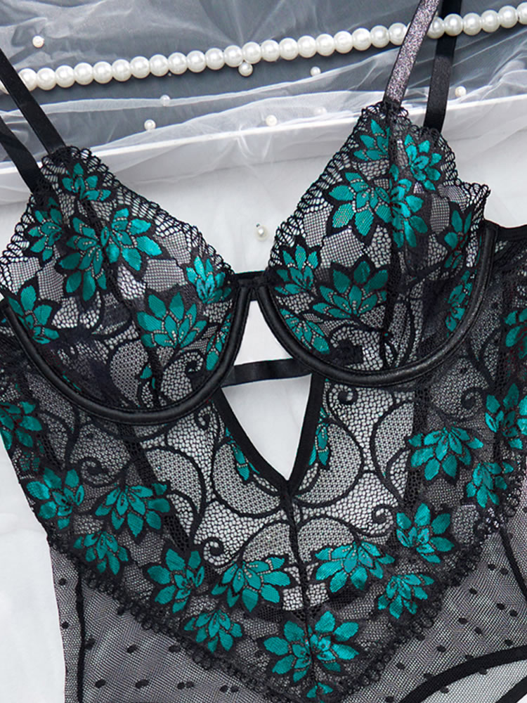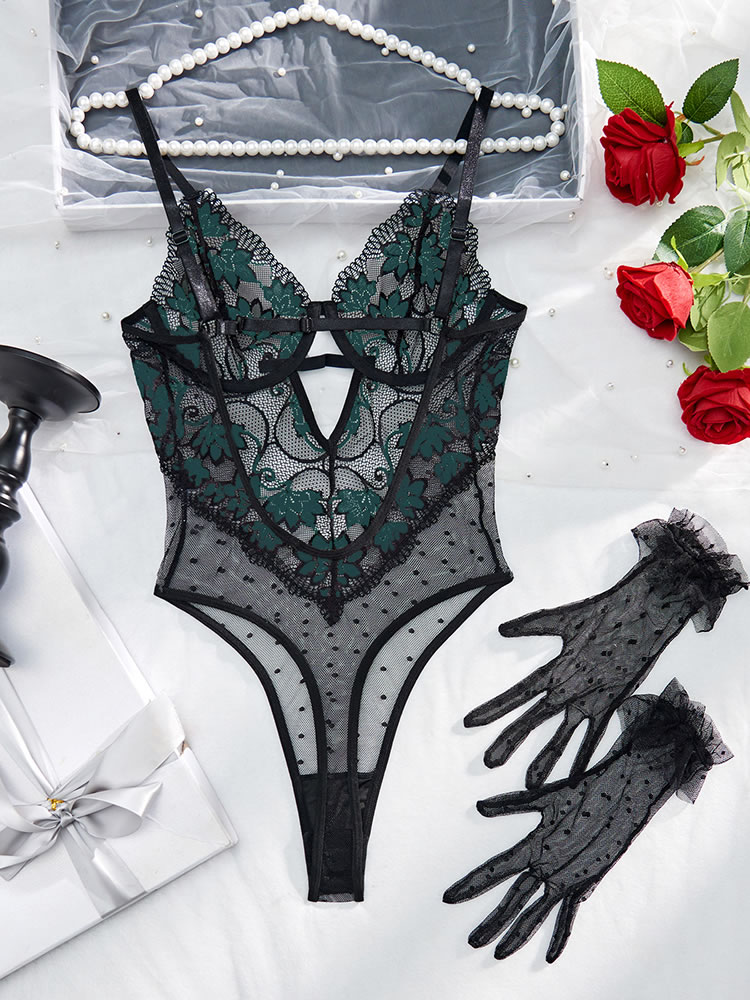 Now offered in a mesmerizing black-green hue, our lace teddy embodies sophistication and allure. Designed with adjustable straps for optimum comfort, it features sheer lace underwire cups that accentuate curves with elegance. The sheer lace bodice adorned with delicate flower embroidery adds a romantic touch. Complete with a tantalizing thong bottom and matching gloves, this ensemble promises to captivate and entice.