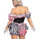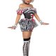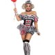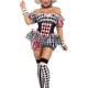 This eye-catching clown costume blends whimsy and style with its striking black, white, and red color scheme. The structured corset top features a playful harlequin pattern and bold red buttons, while the off-the-shoulder design is accentuated by voluminous ruffles. The short, flared Jumpsuit combines striped and diamond prints for a dynamic look, completed with matching accessories like gloves, and a pointed jester hat—ideal for festive occasions or creative roleplay.(Knee-high socks not included)