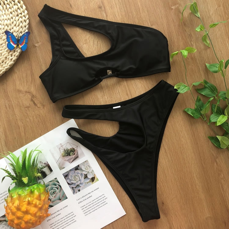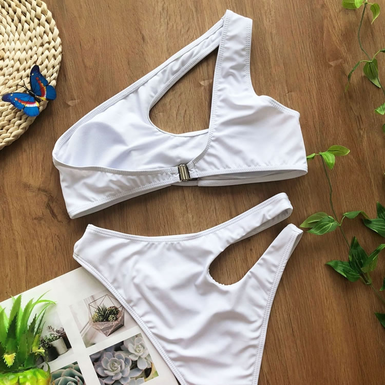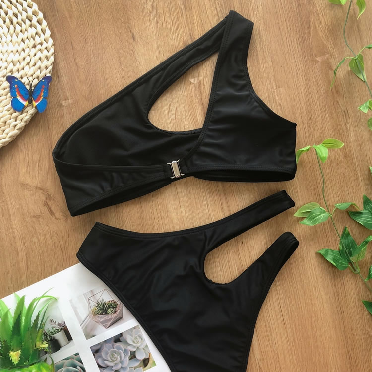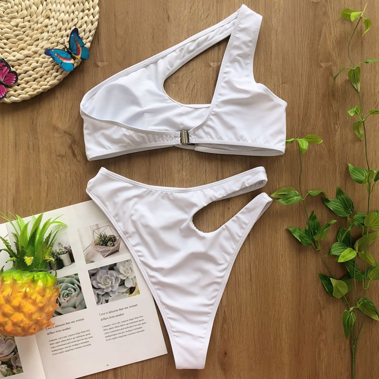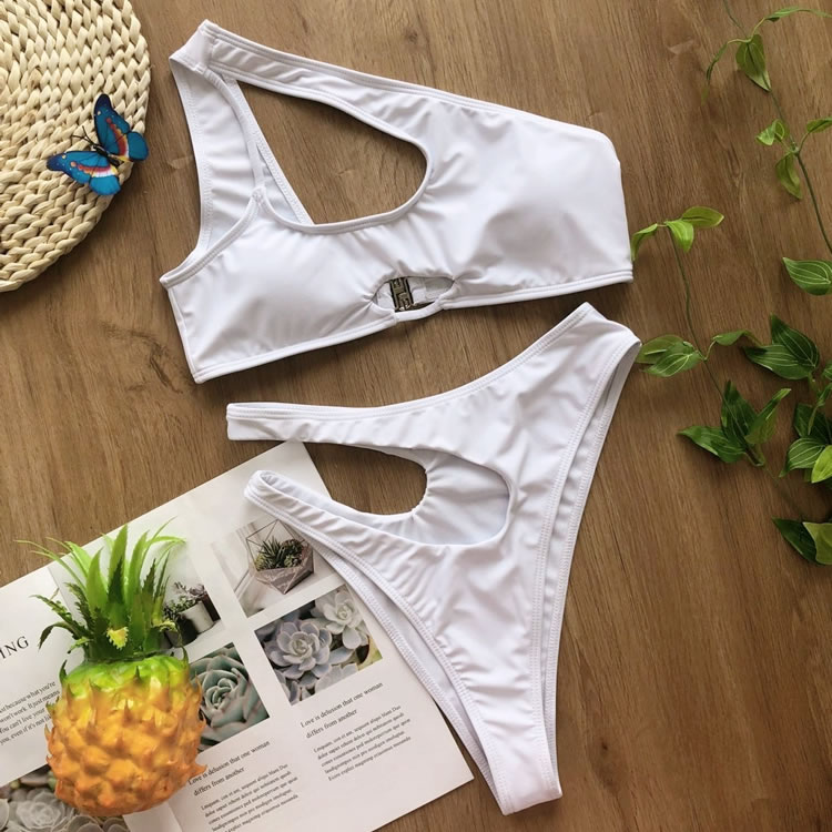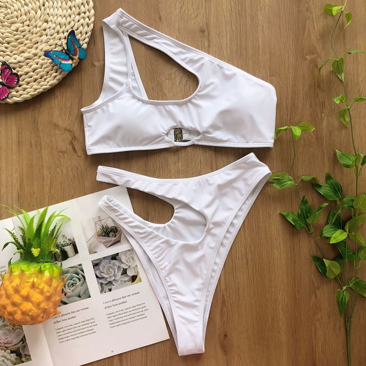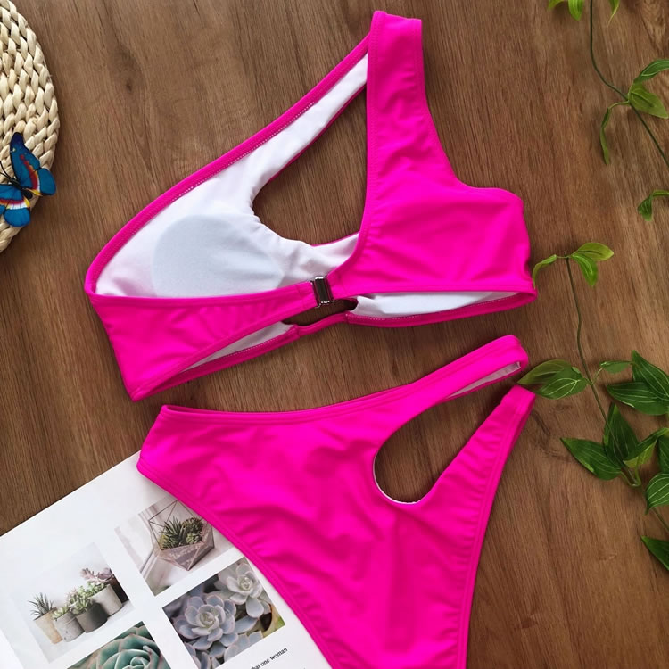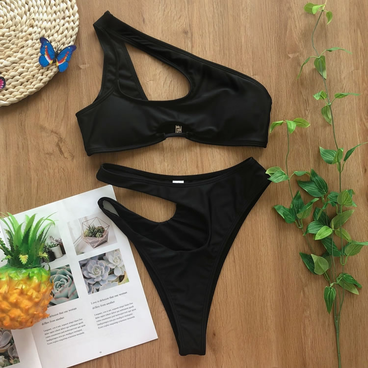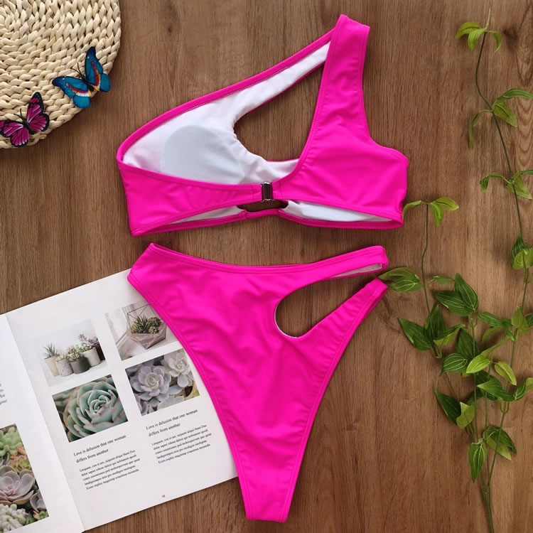Look sexy in the sun, and bump up the sophistication in this exclusive two piece swimsuit featuring solid cups, a cut-out one shoulder style, a small bust keyhole, a hook back closure, and a matching cut-out bottom with a cheeky cut back