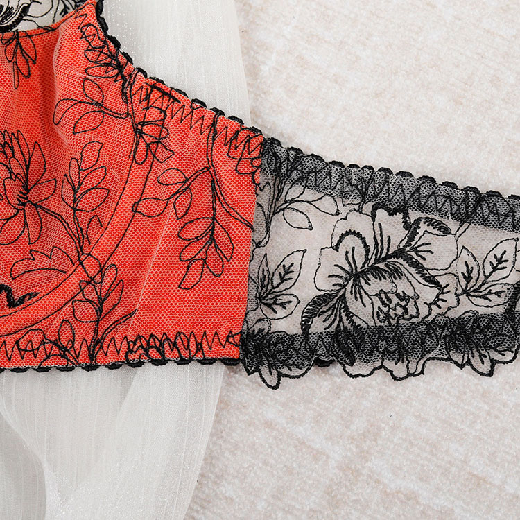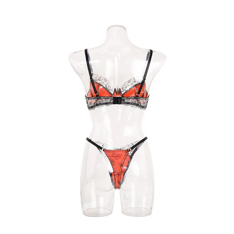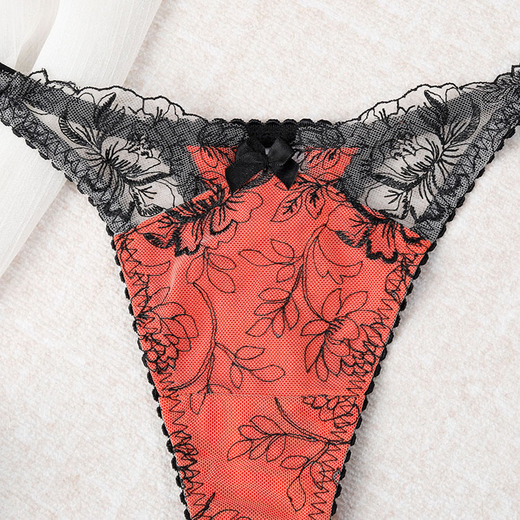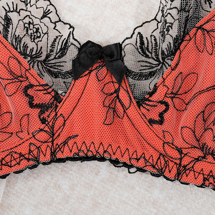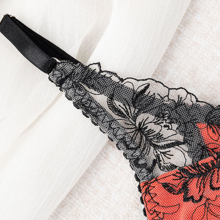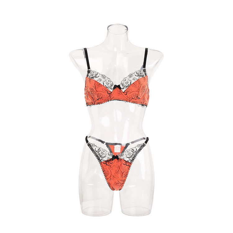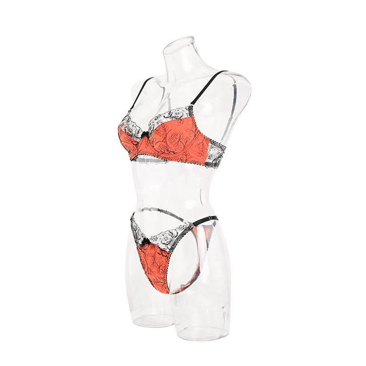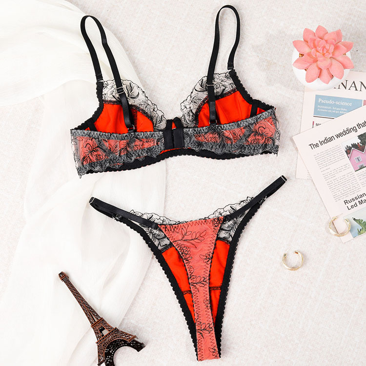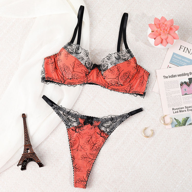 Stand out with this vibrant floral lingerie set that combines bold colors and intricate designs. The orange and black floral patterns on the underwire bra provide both support and a striking visual appeal, while the matching thong panties enhance your natural curves. Perfect for those who want to feel confident and stylish in their intimate wear, this set is ideal for special occasions or everyday elegance.