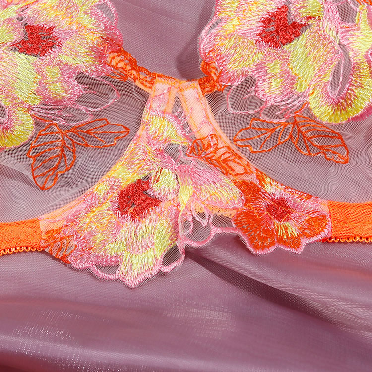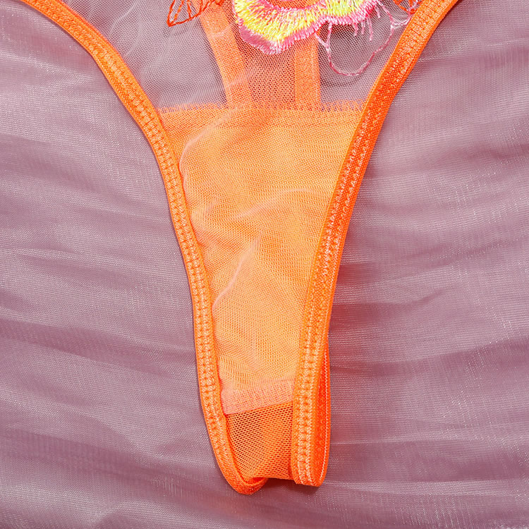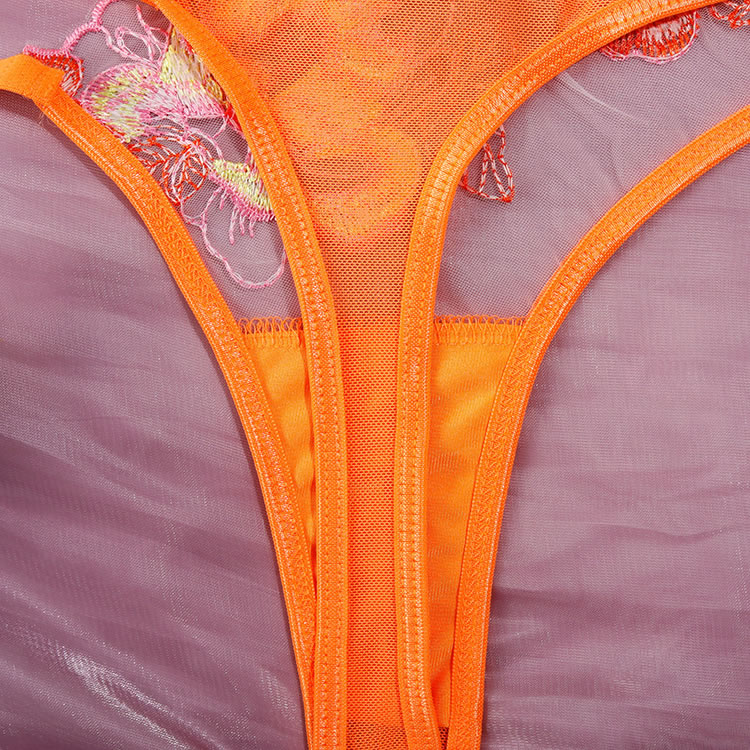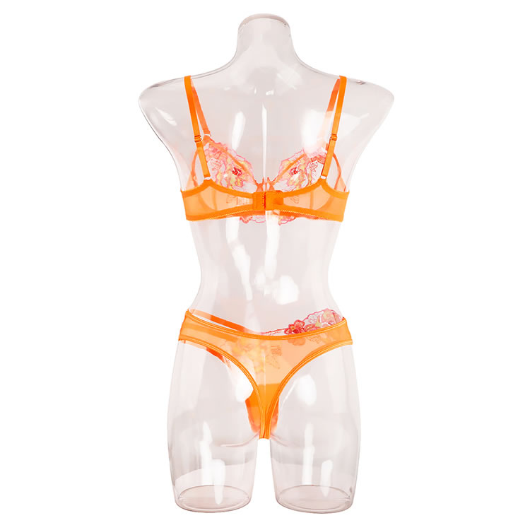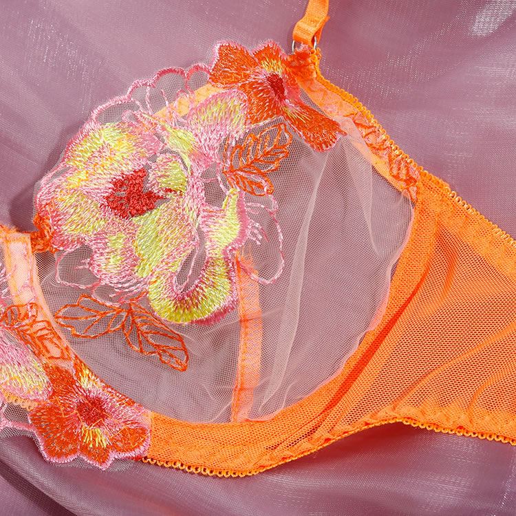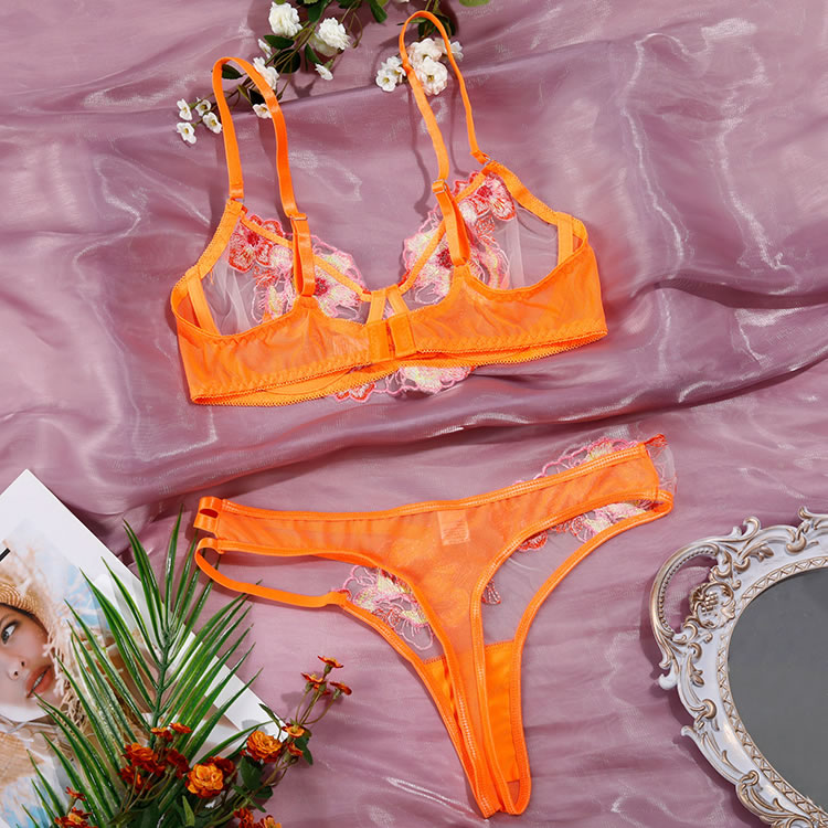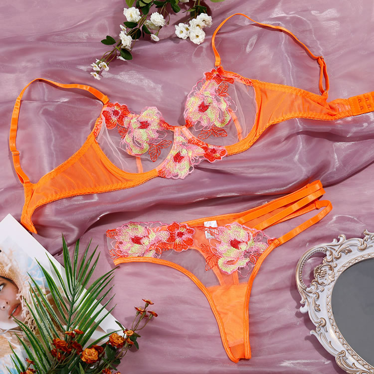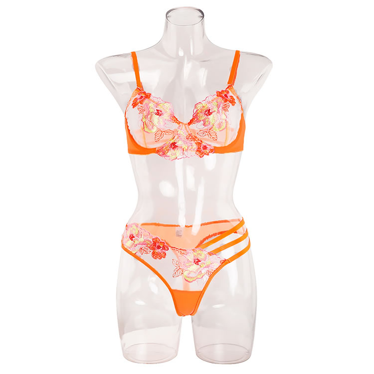 This vibrant orange lingerie set combines bold color with a delicate floral design. The bra features sheer mesh panels adorned with colorful embroidered flowers, offering both support and visual appeal. Paired with a matching thong that has layered side straps for added flair, it’s designed to make a statement. The thin adjustable straps and minimalist back closure enhance comfort while maintaining a sleek silhouette—perfect for those who love expressive and eye-catching styles.