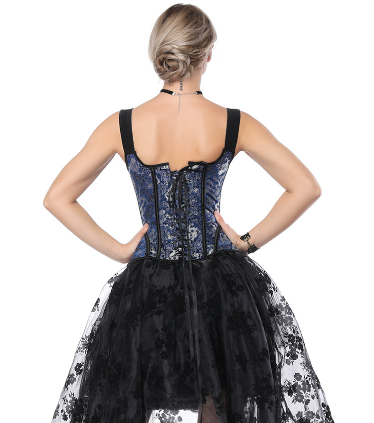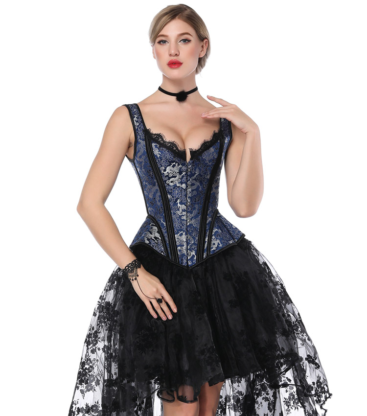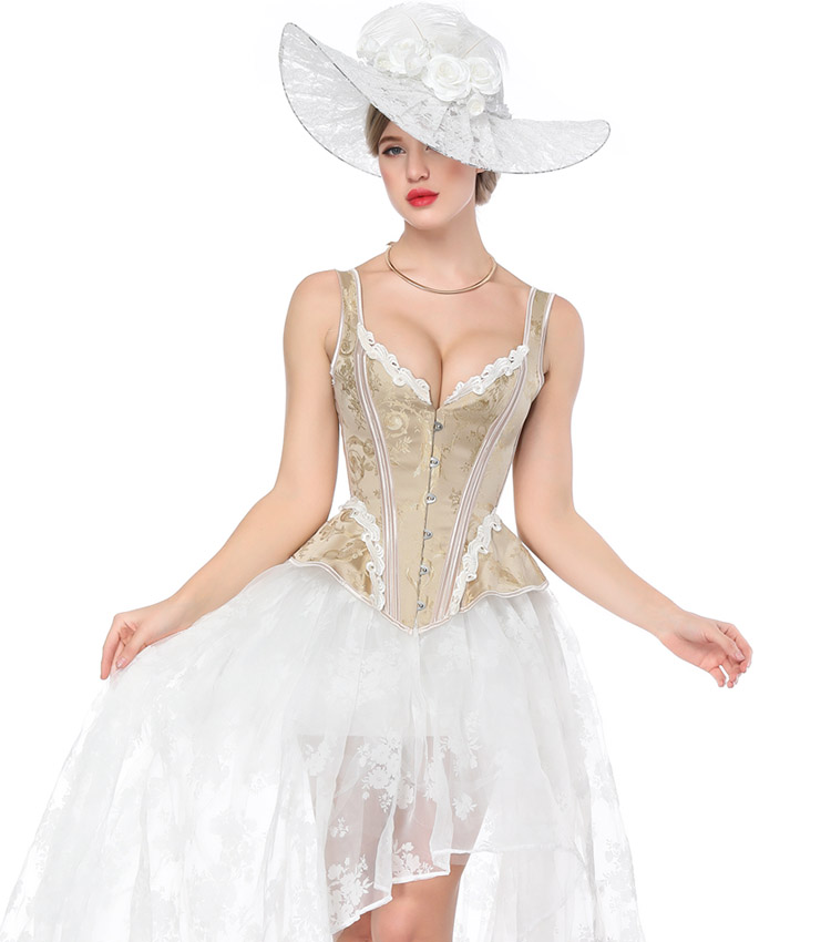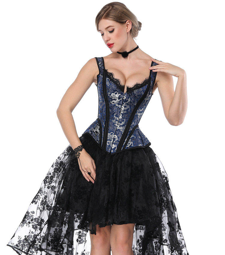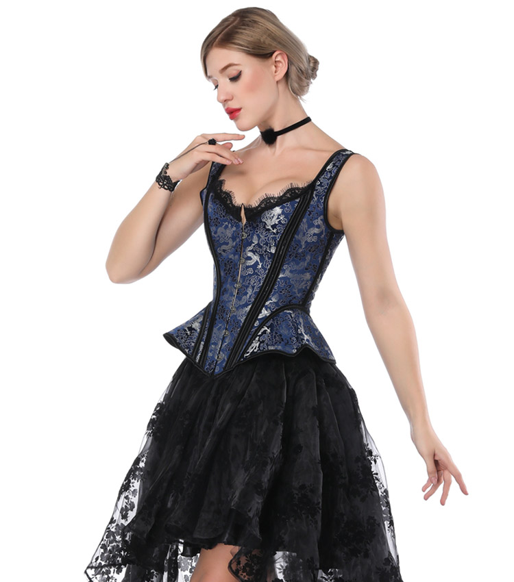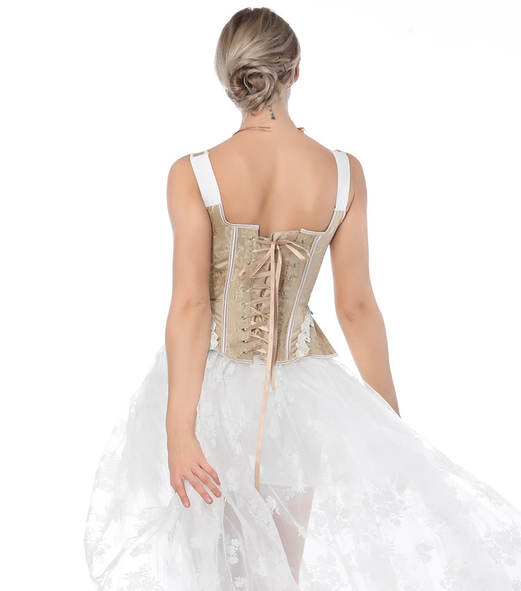 This vintage corset featuring a sweetheart neckline, lace trim detailing, shoulder straps, front steel busk closure and lace-up at back for cinching.