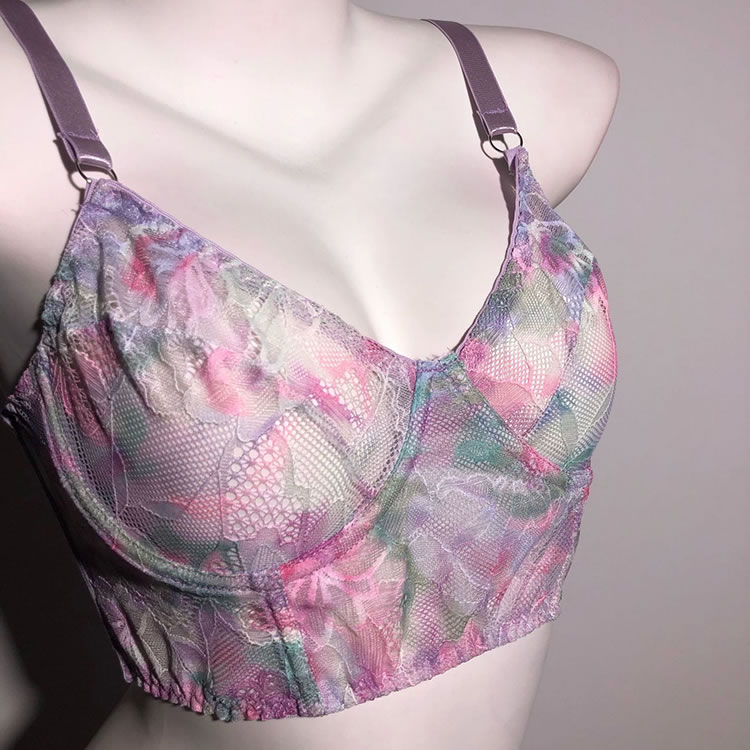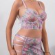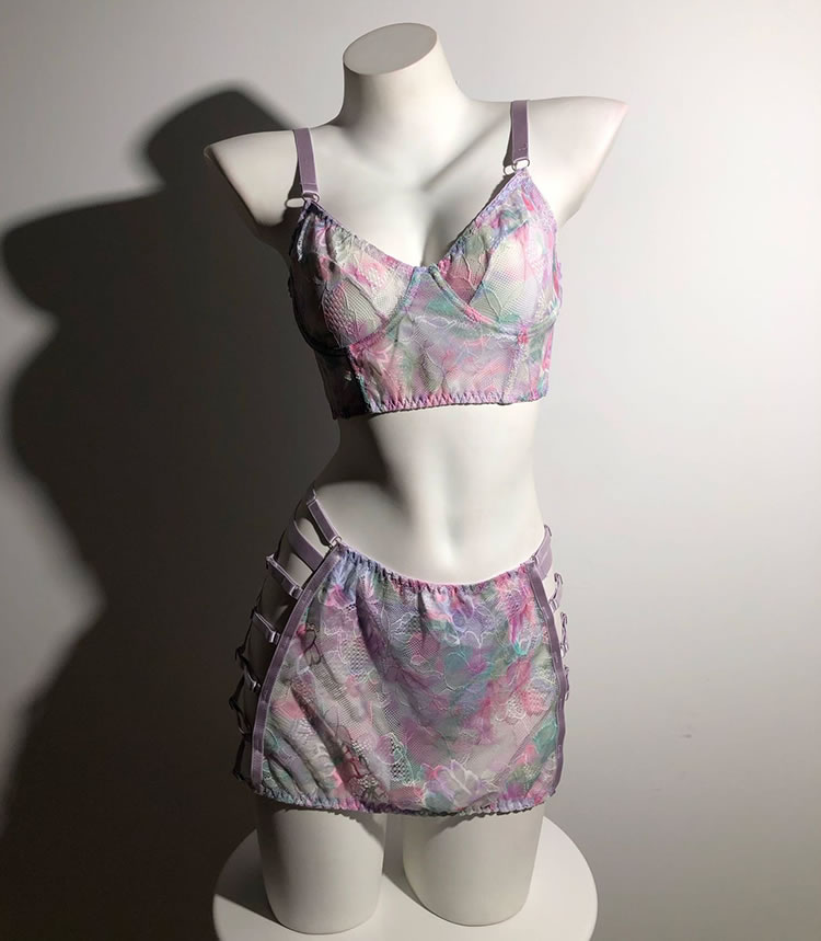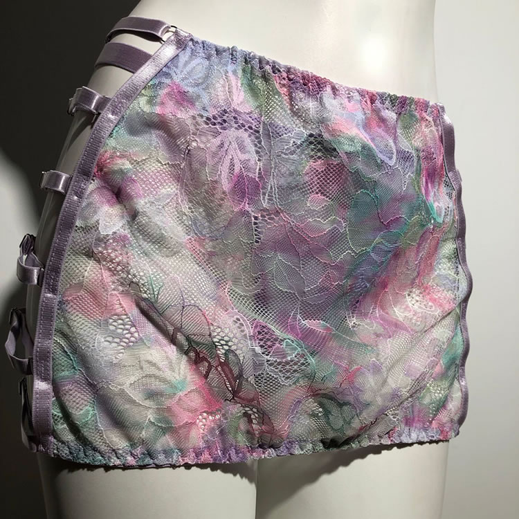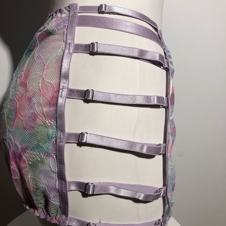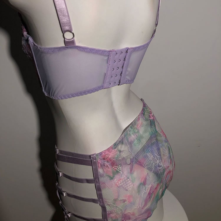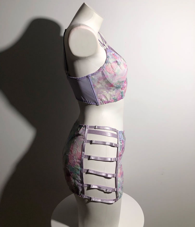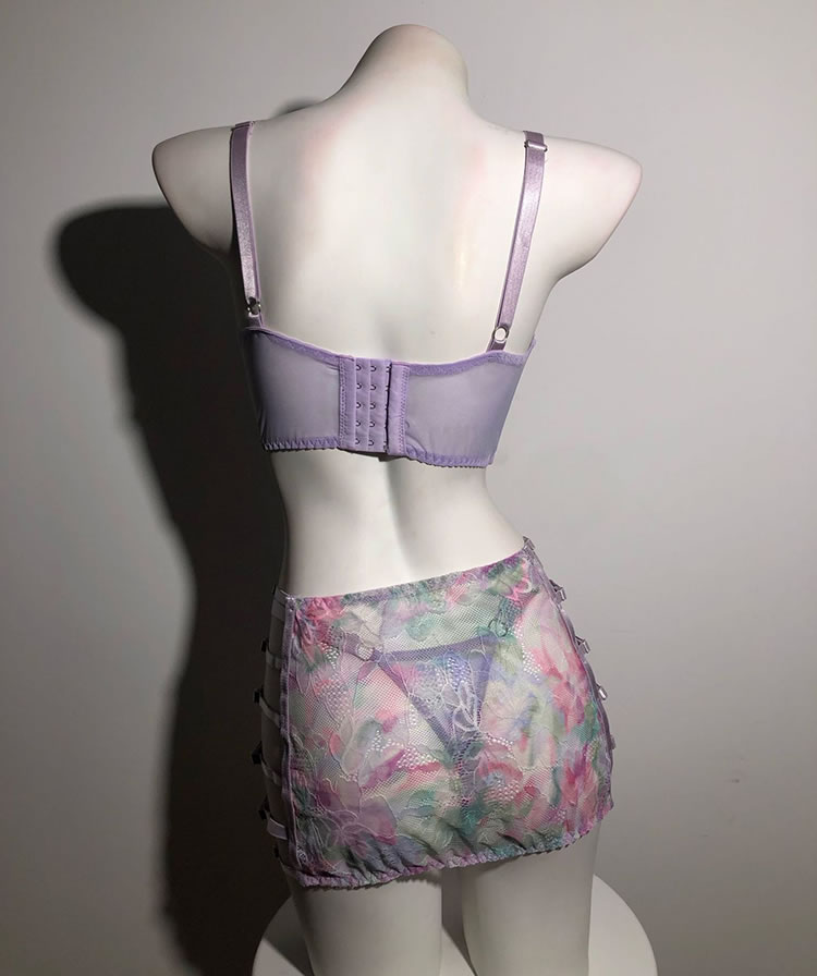 This eye-catching three-piece set blends bold colors with delicate lace to create a fun and flirty look. The bra features a sheer mesh base with floral embroidery in soft pastels, while the matching high-waisted skirt-style bottom includes side straps that add a modern edge. Designed to stand out, it’s perfect for those who love to mix romance with a touch of daring.