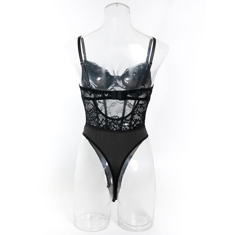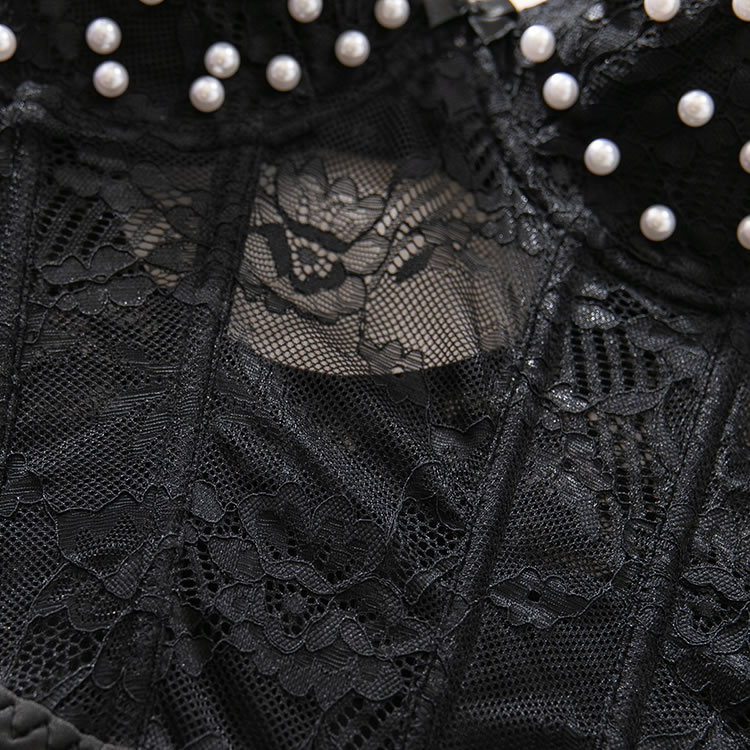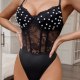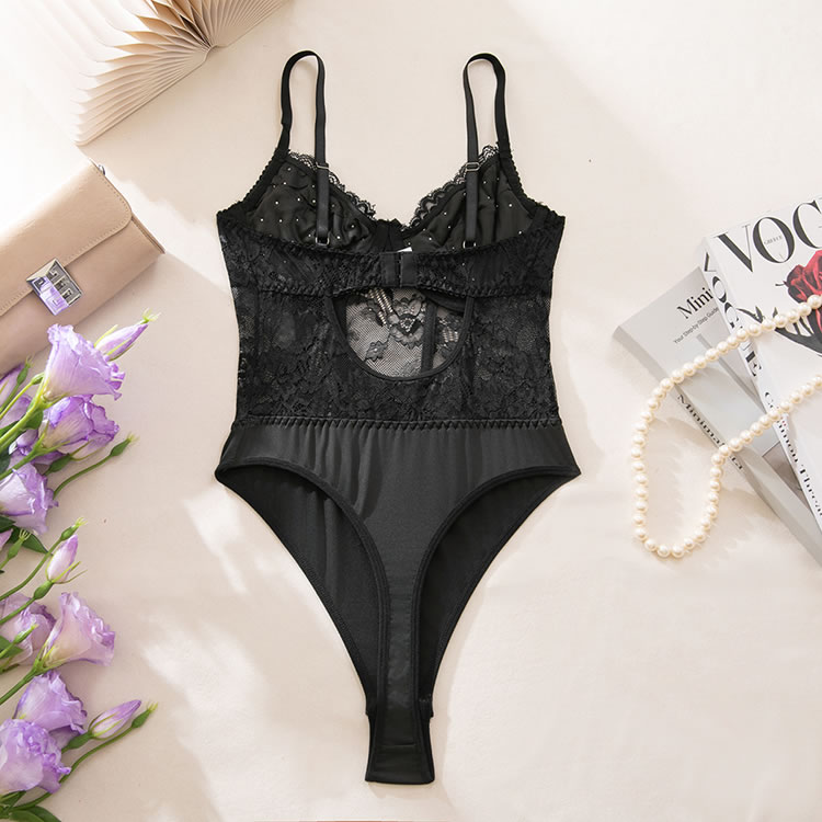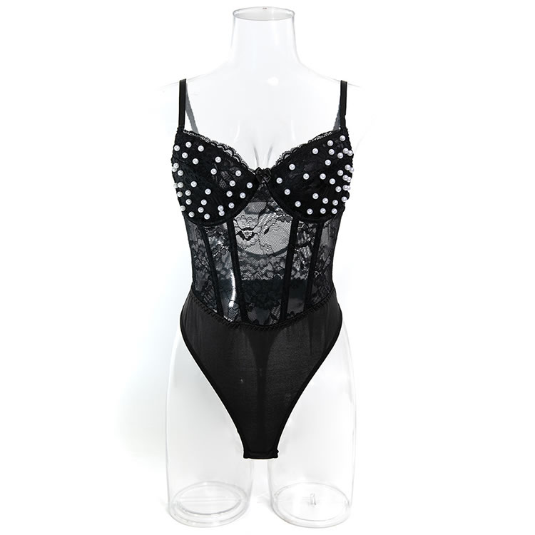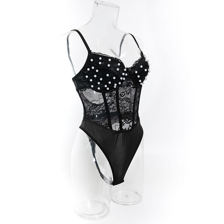 This exquisite teddy masterfully blends classic romance with modern sensuality. The bust is lavishly decorated with an array of faux pearls, creating a stunning, textured focal point. Below, a sheer floral lace corset-style bodice cinches the waist, offering a glimpse of skin while providing a structured, flattering silhouette. The design flows into a smooth, high-cut bottom, creating an elegant and captivating look perfect for a special night.