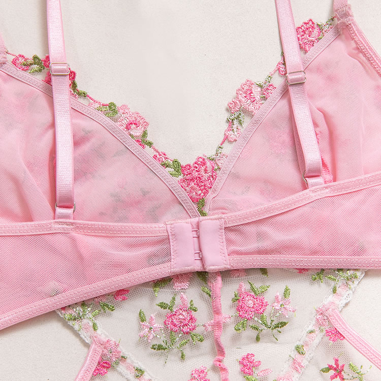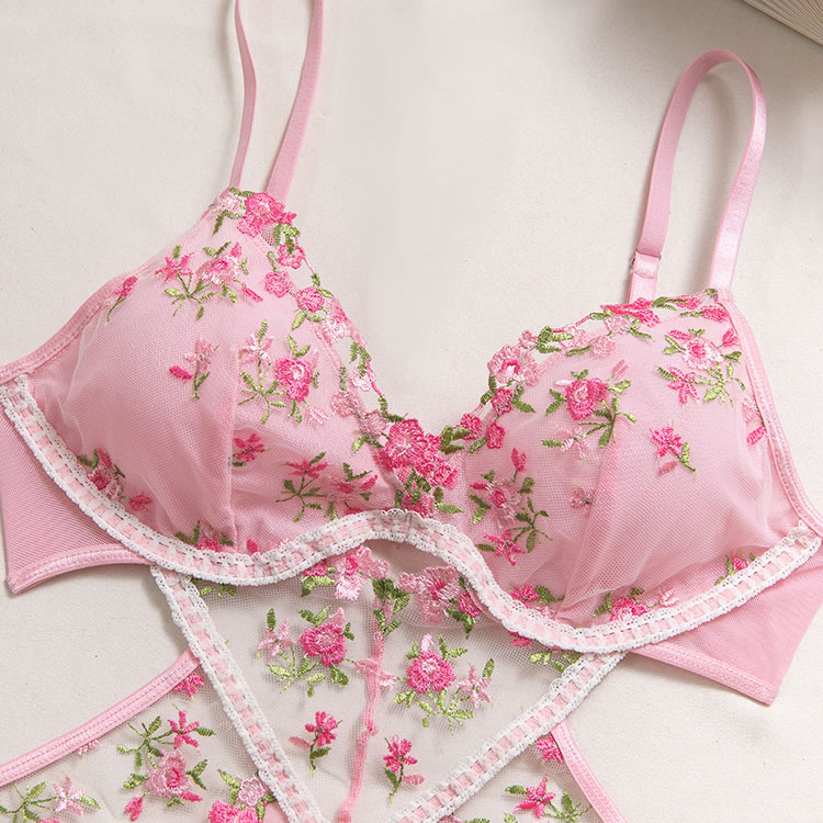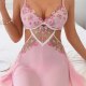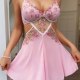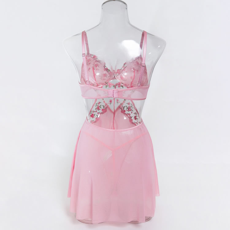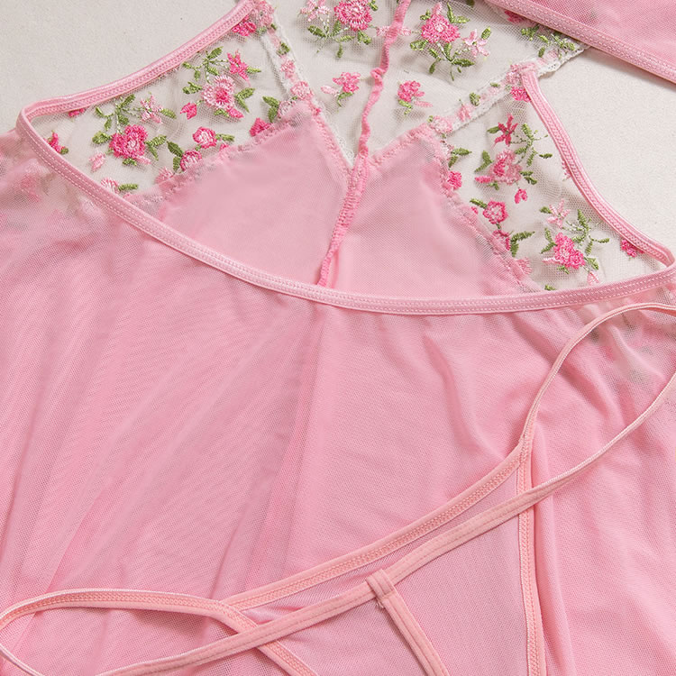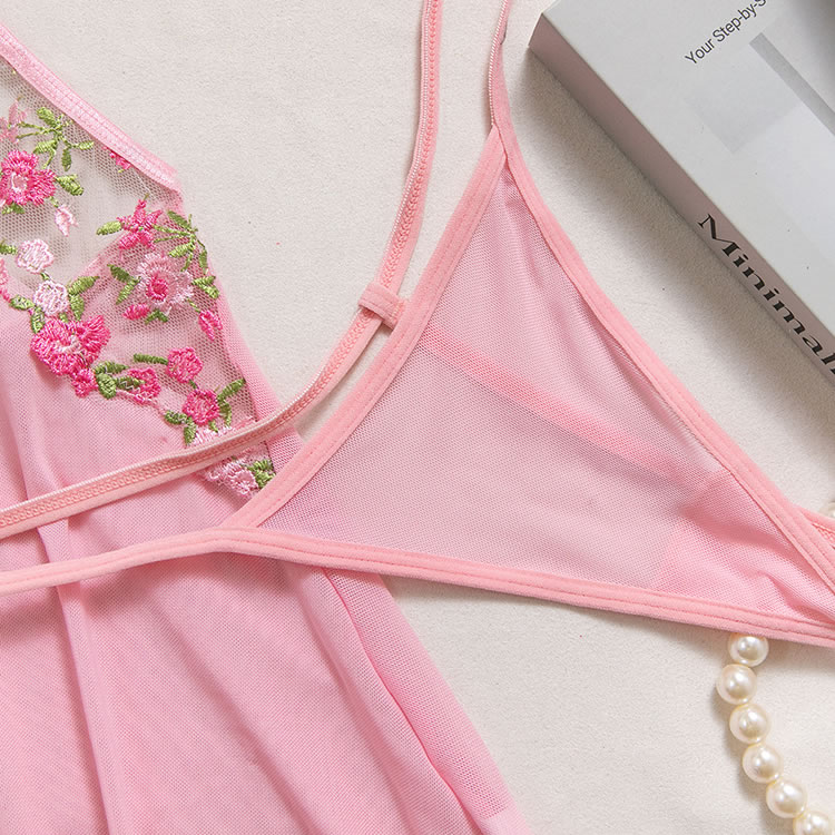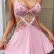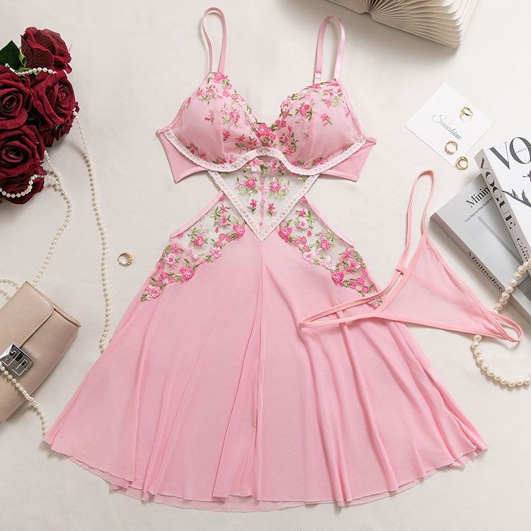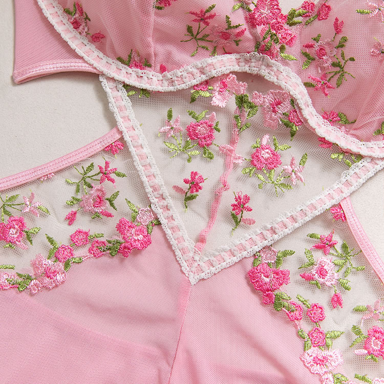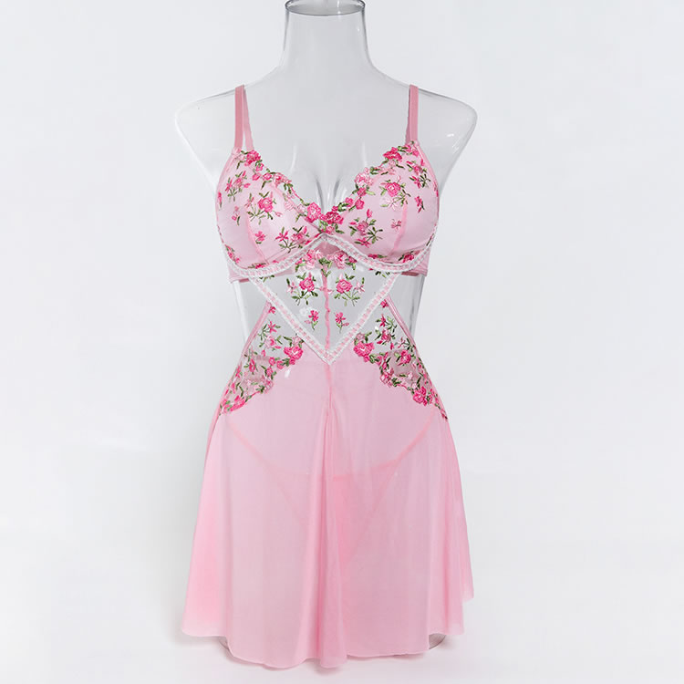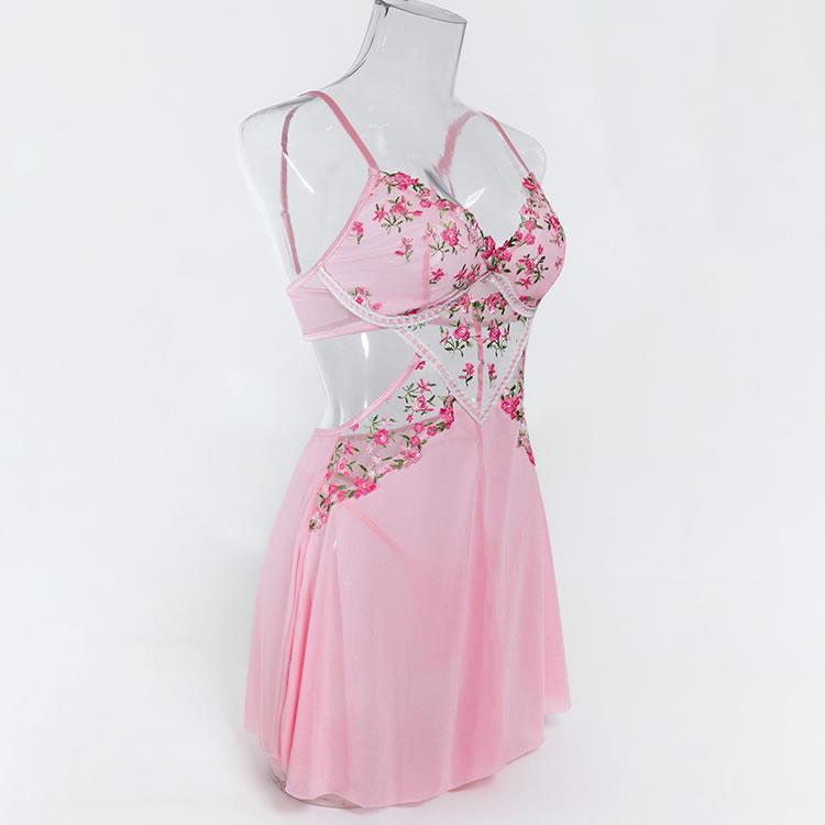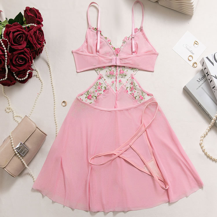 Capture a soft, romantic vibe with this pink babydoll chemise. The set features a bralette top adorned with vibrant floral embroidery in shades of pink and green, adding a touch of garden-inspired beauty. A sheer mesh panel with embroidered detailing connects the bust to the flowy, A-line skirt, creating a flattering cutout effect at the waist. Finished with delicate lace trim and adjustable straps, this piece blends comfort with a feminine silhouette perfect for special evenings.
