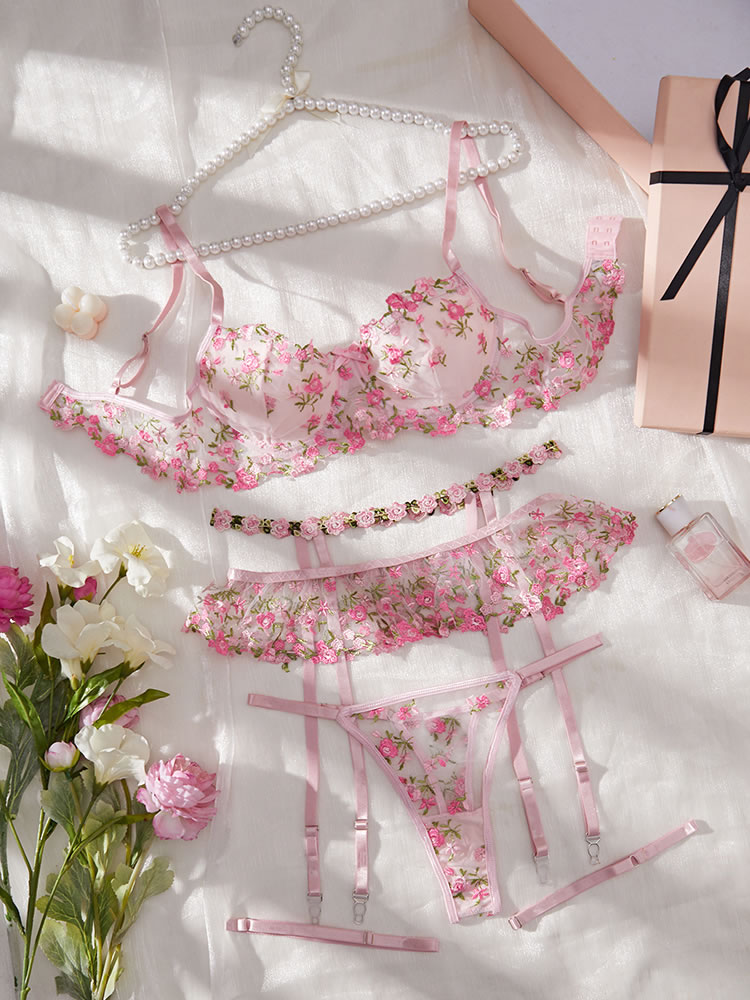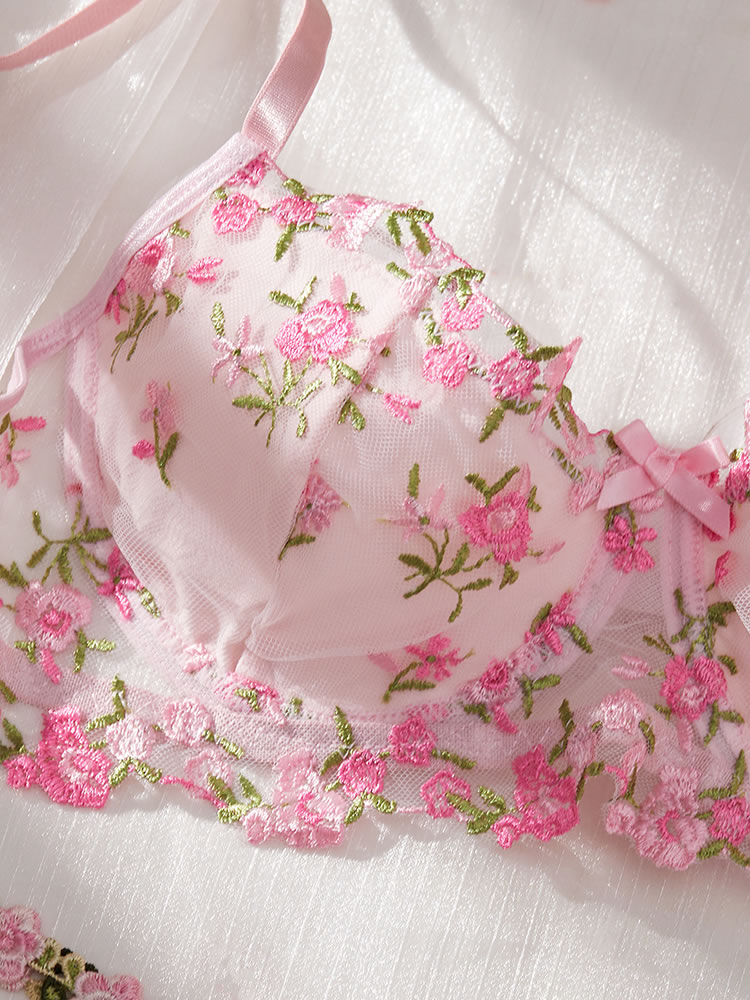 This charming lingerie set combines soft pink tones with delicate floral embroidery that brings a touch of romance to every look. The underwire bra features a sweetheart neckline and lace trim along the edges, offering both support and style. Paired with a matching high-waisted thong adorned with a tulle ruffle and garter straps, it creates a playful yet elegant silhouette perfect for intimate moments or special occasions.