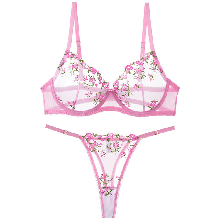 This sweet pink lingerie set features a sheer mesh base adorned with embroidered floral patterns that add a romantic touch. The underwire bra offers gentle shaping with thin straps and a secure back closure, while the matching thong delivers a clean, minimalist silhouette with just enough coverage. Designed for comfort and charm, it’s perfect for intimate moments or adding a soft accent to your everyday wardrobe.