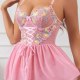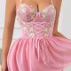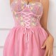This playful pink lingerie dress combines a flirty silhouette with eye-catching floral embroidery. The bustier-style top features colorful lace appliqués in soft pastel tones, creating a romantic and whimsical look. A front lace-up design adds structure and adjustability, while the attached sheer skirt flows gently to enhance movement. Thin spaghetti straps complete the delicate look, making it perfect for adding charm to intimate moments or themed occasions.