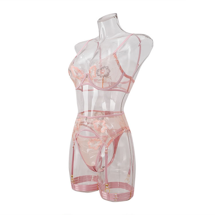 This romantic four-piece lingerie set features delicate floral embroidery on a sheer mesh base, creating a beautifully feminine look. The underwire bra offers gentle support and a flattering shape, while the matching garter belt has a cheeky cut and an open-back design for a modern touch. Complete with a matching thong and adjustable garter straps that connect to topped thigh bands, this set is perfect for a special occasion.